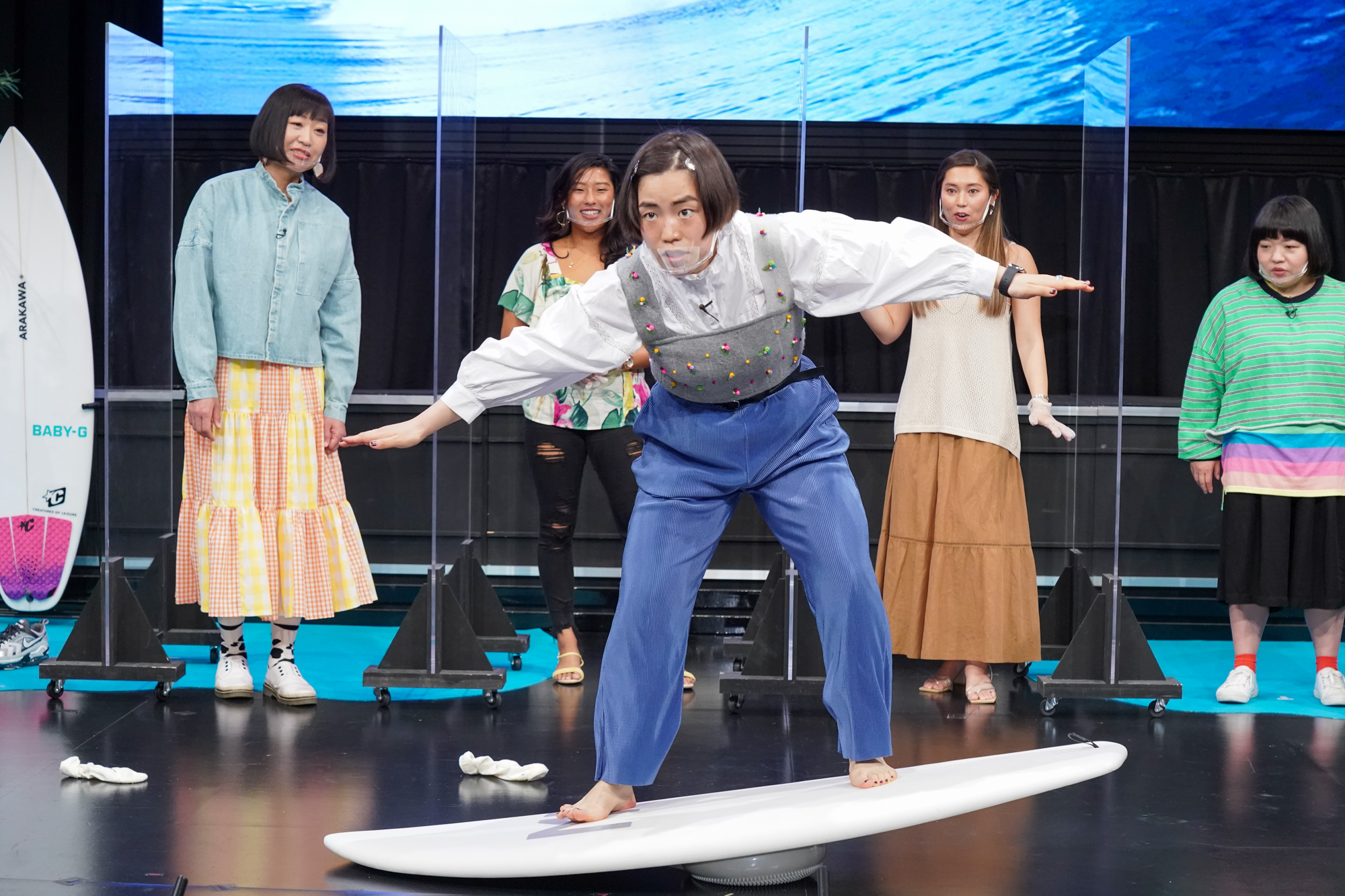 ふたりの実績をはじめ、サーフィンの競技形式の紹介などをわかりやすく紹介したり、用意されたバランスボールとサーフボードで擬似サーフィンに挑戦したり、また、海をフィールドとするサーファーだからこそ隣り合わせにある環境問題に関することなど、吉本興業ならではのお笑いを交えながらの正式発表となった。