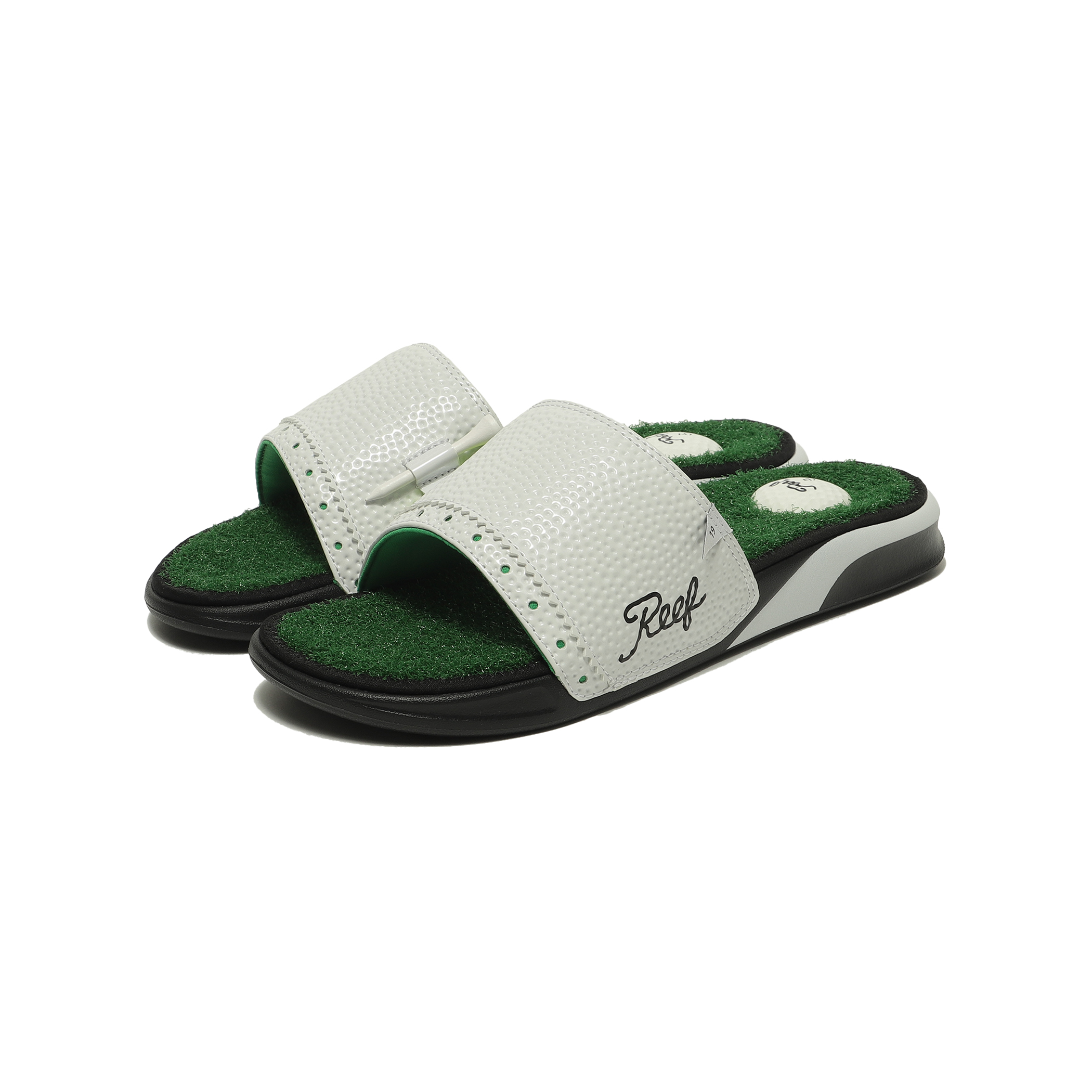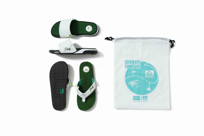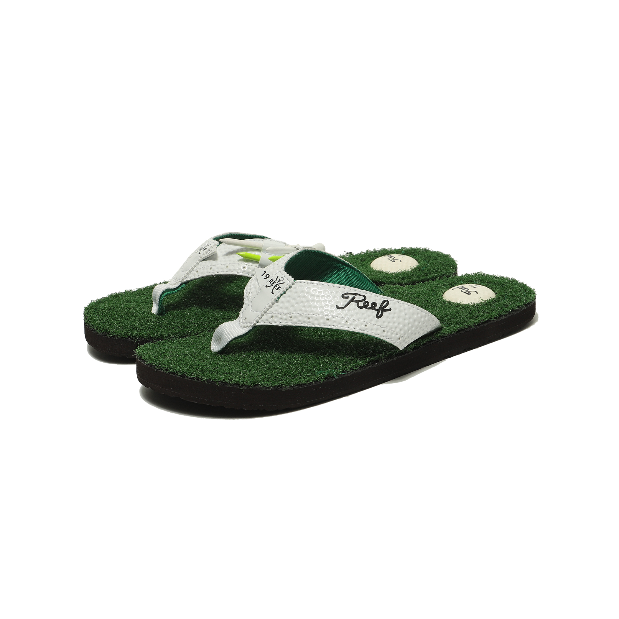 人工芝を全面に表現したEVA素材のフットベッド、ゴルフボールをイメージしたメダリオンが特徴のラバーストラップ、かかと部分にはクッション性のあるゴルフボールをデザインが施されたカスタムゴルフティーとサンダルバッグをセットにしたスペシャルアイテム、要チェックとなっている!