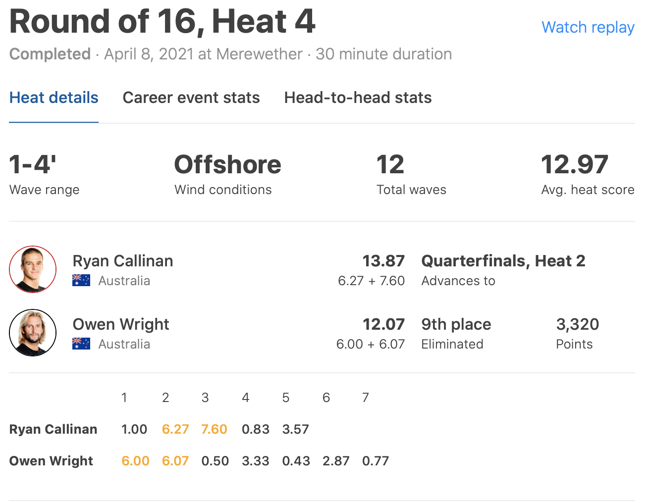 続くヒート4ではMorgan Cibilicと同じくニューカッスル出身のCTサーファーRyan CallinanがOwen Wrightを相手に接戦を繰り広げた末、見事ラウンドアップ。