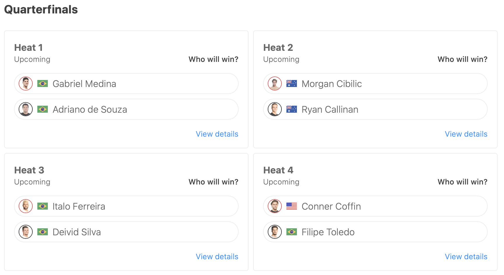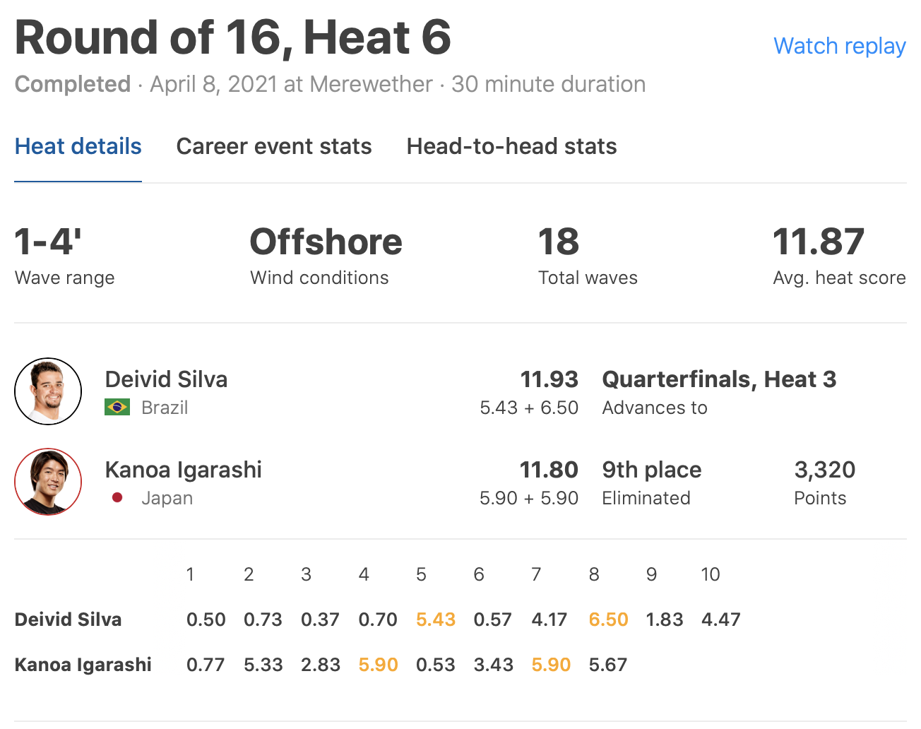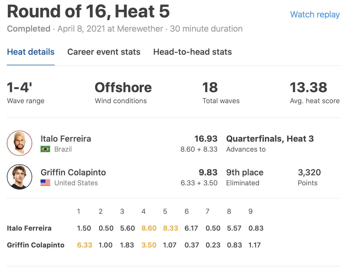 対戦相手であるGriffin Colapintoの追従をまったく許さない圧倒的サーフィンでクォーターファイナル進出を決めた。