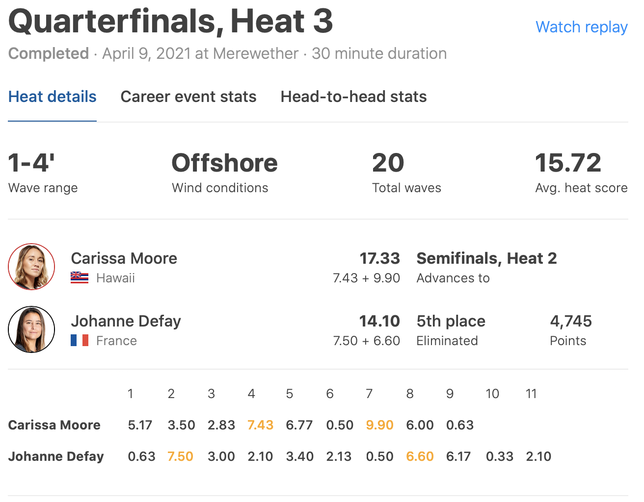 ヒート3にはもうひとりの女王と呼ぶにふさわしいワールドチャンプCarissa MooreがJohanne Defayを相手に、まさにWOMENSのサーフィンがすでにネクストレベルに達していることを痛感せざるを得ない見事なエアリバースを披露。