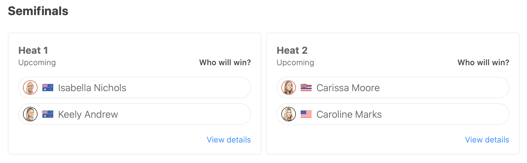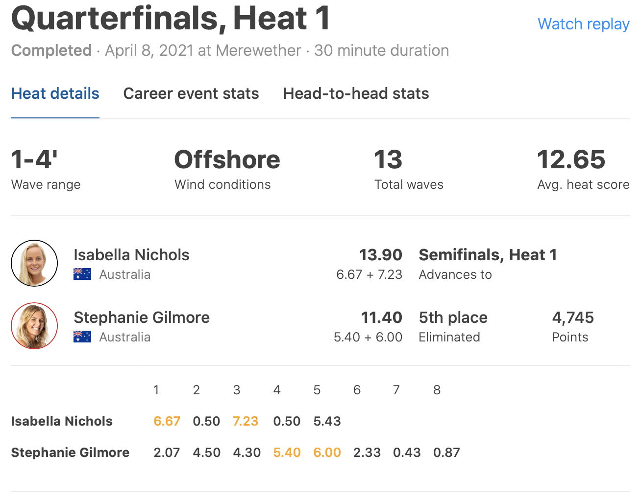 その活躍に注目が集まったが、対戦相手でCTルーキーのIsabella Nicholsが先制攻撃に出て6.67ptと7.00ptといったグッドスコアをまとめると、さすがの女王もいい波が少ないこの日の会場のコンディションに翻弄される形となってしまい、最後まで逆転できずに惜しくもここで敗退となってしまった。