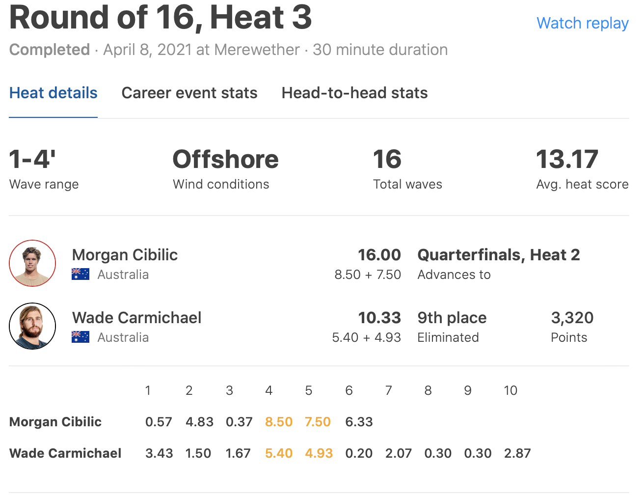 MENSではラウンドオブ16のヒート3に登場したロコボーイでCTルーキーで今大会ではJohn John Florenceを粉砕したMorgan Cibilicがまたしても素晴らしいパフォーマンスを披露してトータルスコア16.00ptをマーク。