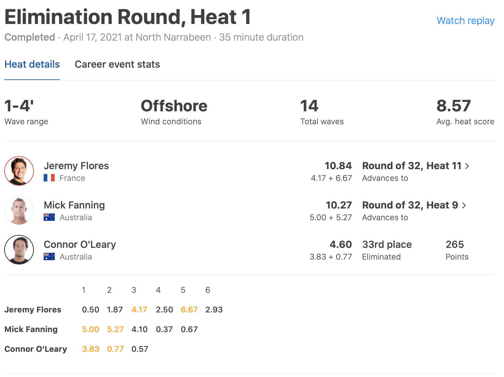 また今大会にワイルドカードで出場する注目の3×ワールドチャンプMick Fanningは、敗者復活戦となるイリミネーション・ラウンドのヒート1でJaremy Floresに次ぐ2位のポジションで歴代グランドチャンプ唐沢明美プロの息子Connor O’Learyを抑えてラウンドアップ。