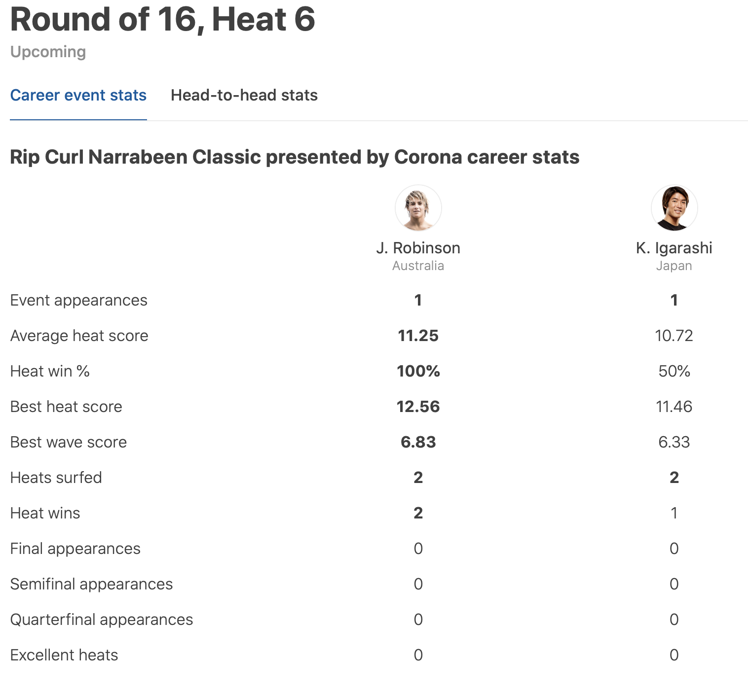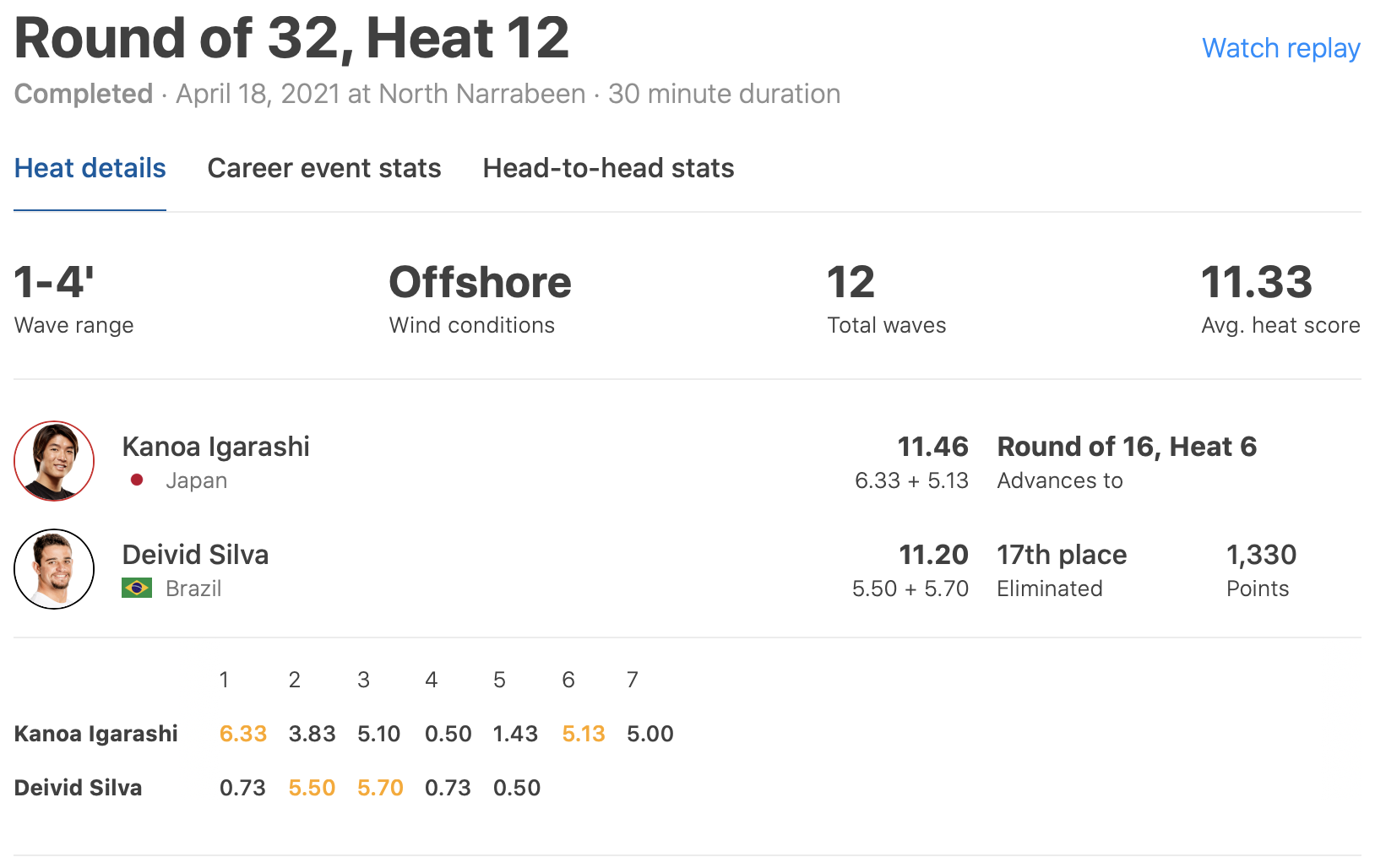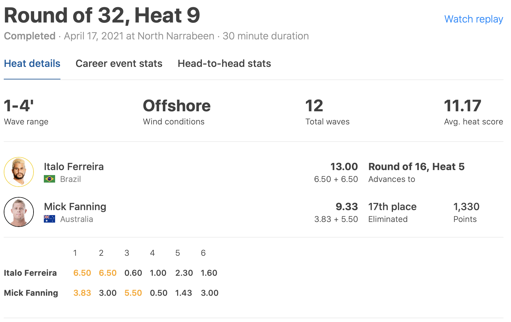 迎えたラウンドオブ32のヒート9では、2019年ワールドチャンプで現在CTランキング1位のItalo Ferreiraと対戦となり、その快進撃が期待されたが、コンディションを選ばずネクストレベルなライディングを連発するItalo Ferreiraの勢いを止めることはできず、惜しくもここで敗退となった。