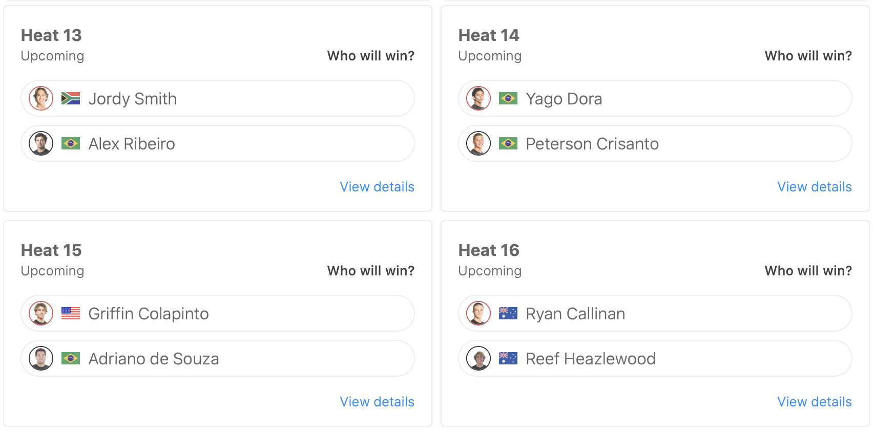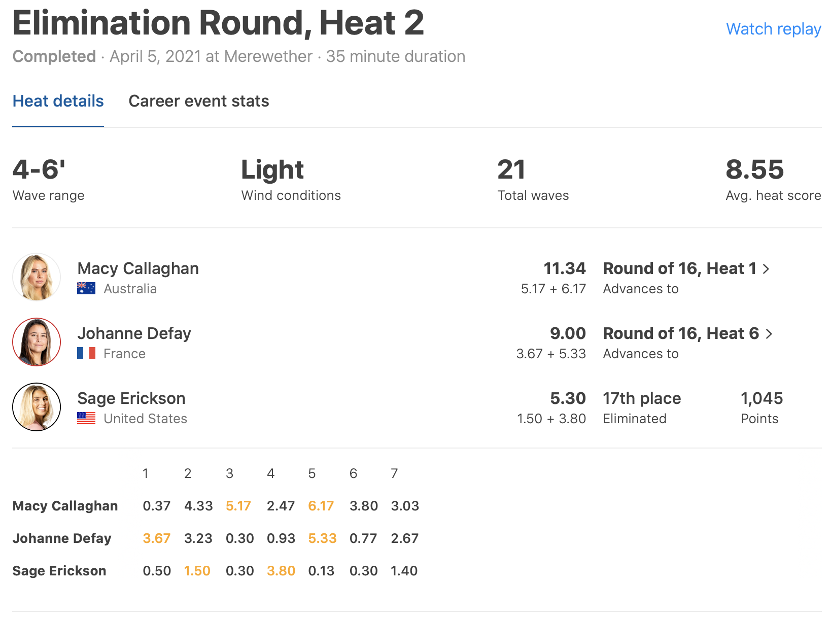 迎える日本時間の4/19(月)午前5:45にはネクストコールが発表予定となっており、コンディションが十分であればコンテストDAY4がオンとなり、消化し切れなかったMENSのラウンドオブ32のヒート13からヒート16まで、もしくはWOMENSのラウンドオブ16からスタートすることが予想される。
