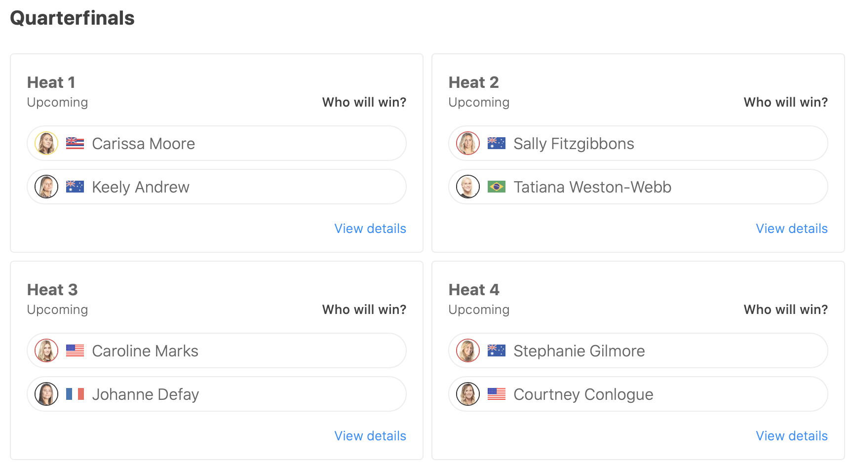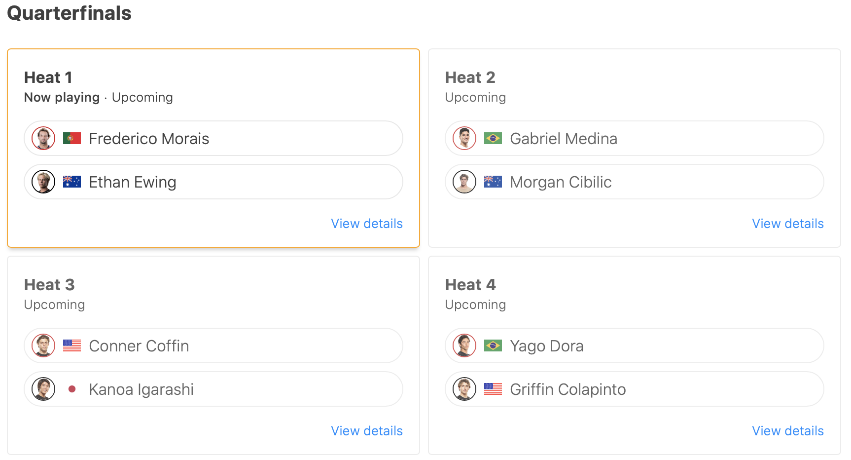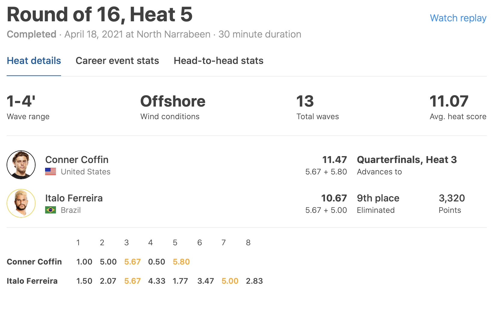 五十嵐カノアはクォーターファイナルのヒート3でConner Coffin対戦予定となっている。