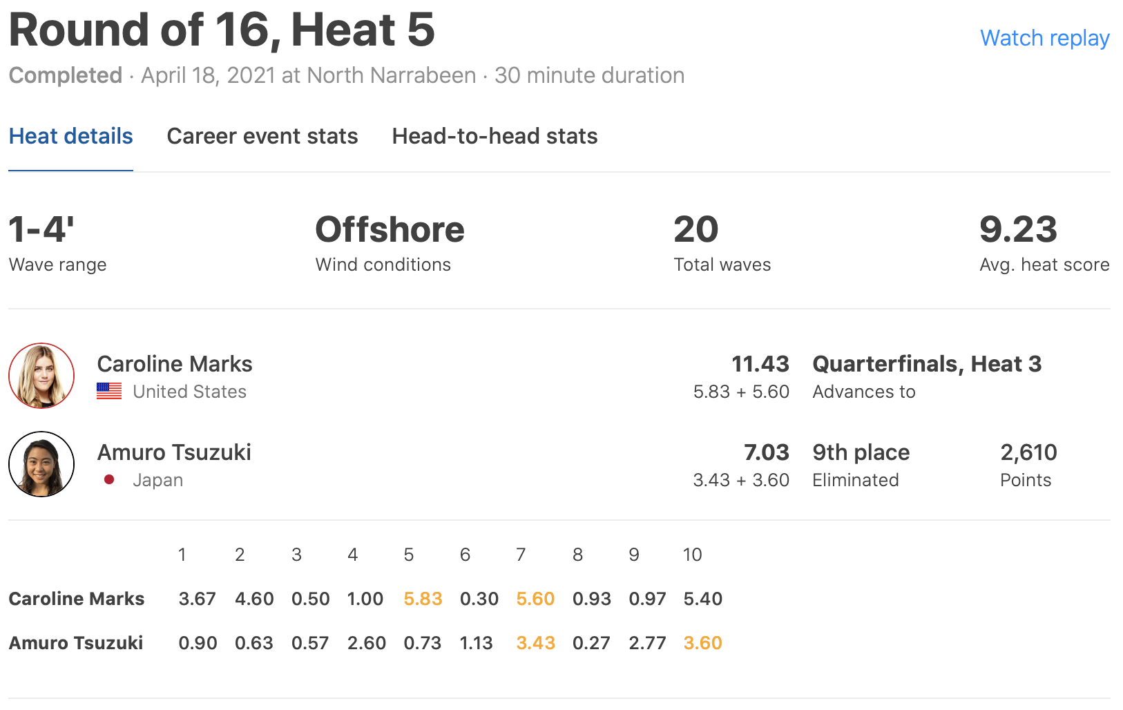 ラウンド1ではCT第2戦で準優勝を果たしたIsabella Nicholsを抑える活躍を魅せただけに今回のヒートでもその快進撃に期待がかかったが、次々と波を掴んでスコアを重ねるCaroline Marksとは正反対にいい波をまったく掴むことができず、その実力を発揮できないままヒートは終了。