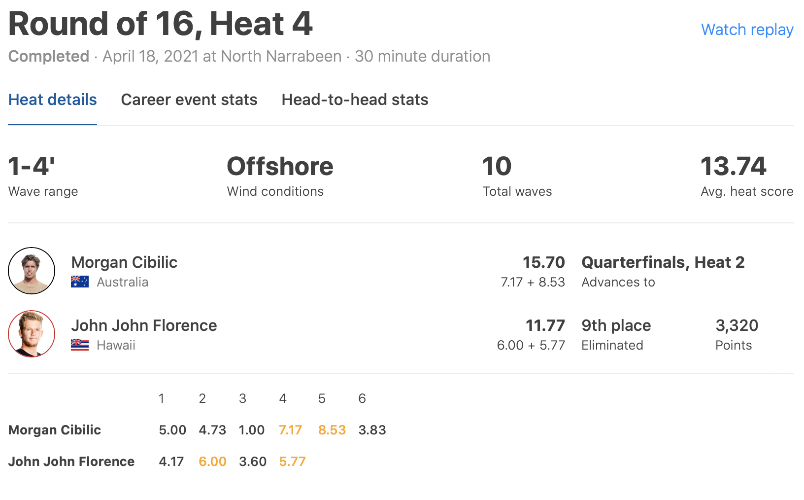 この波がこのヒートのハイエストスコアとなる5.43ptをマークし、見事大逆転でクォーターファイナルへと駒を進めた!!