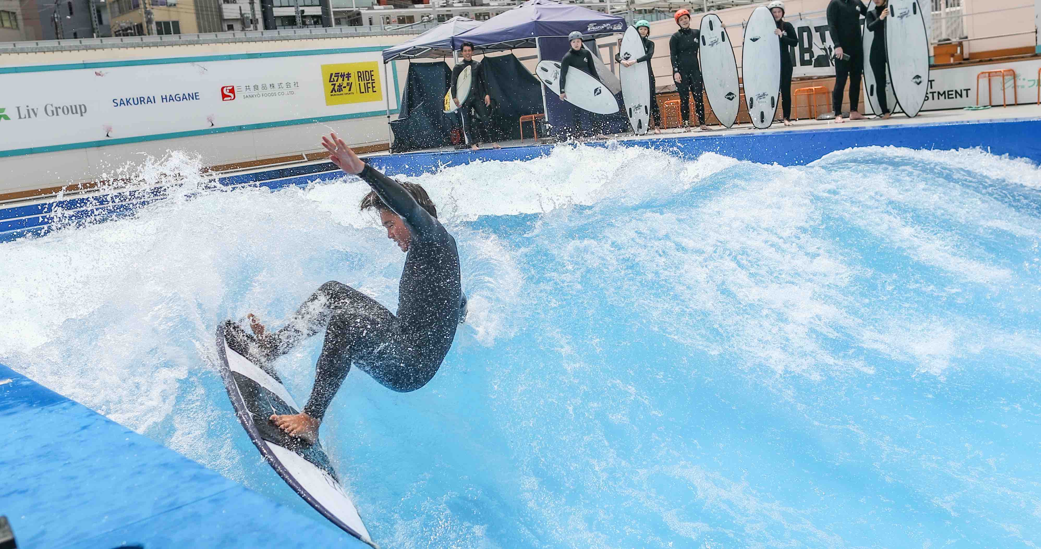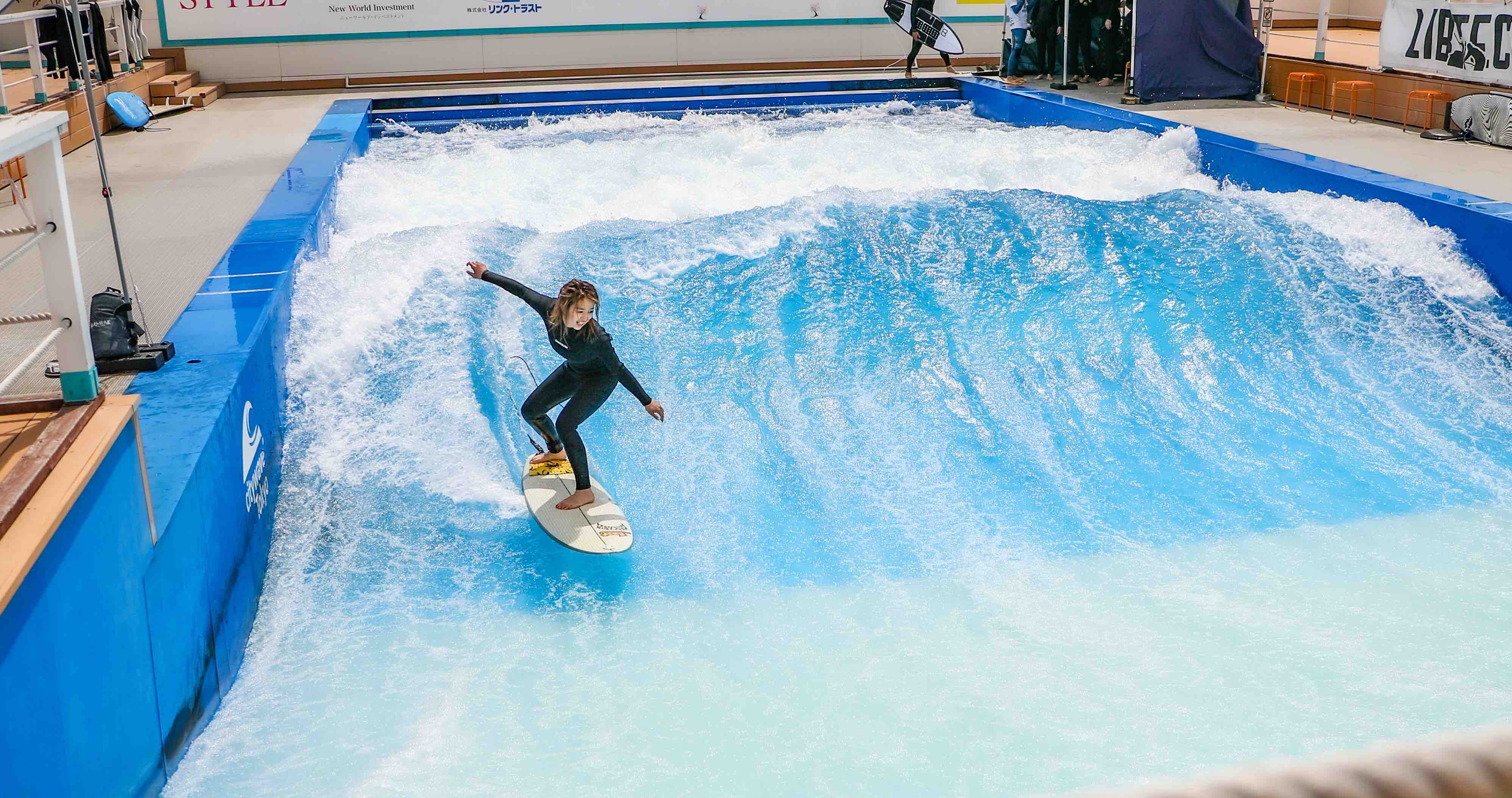 果たして、Citywave Tokyo初心者のともみちゃんは波を選ばず乗りやすさを発揮するLIBTECH surfboardsでこの人工波を乗りこなすことができるのか!?