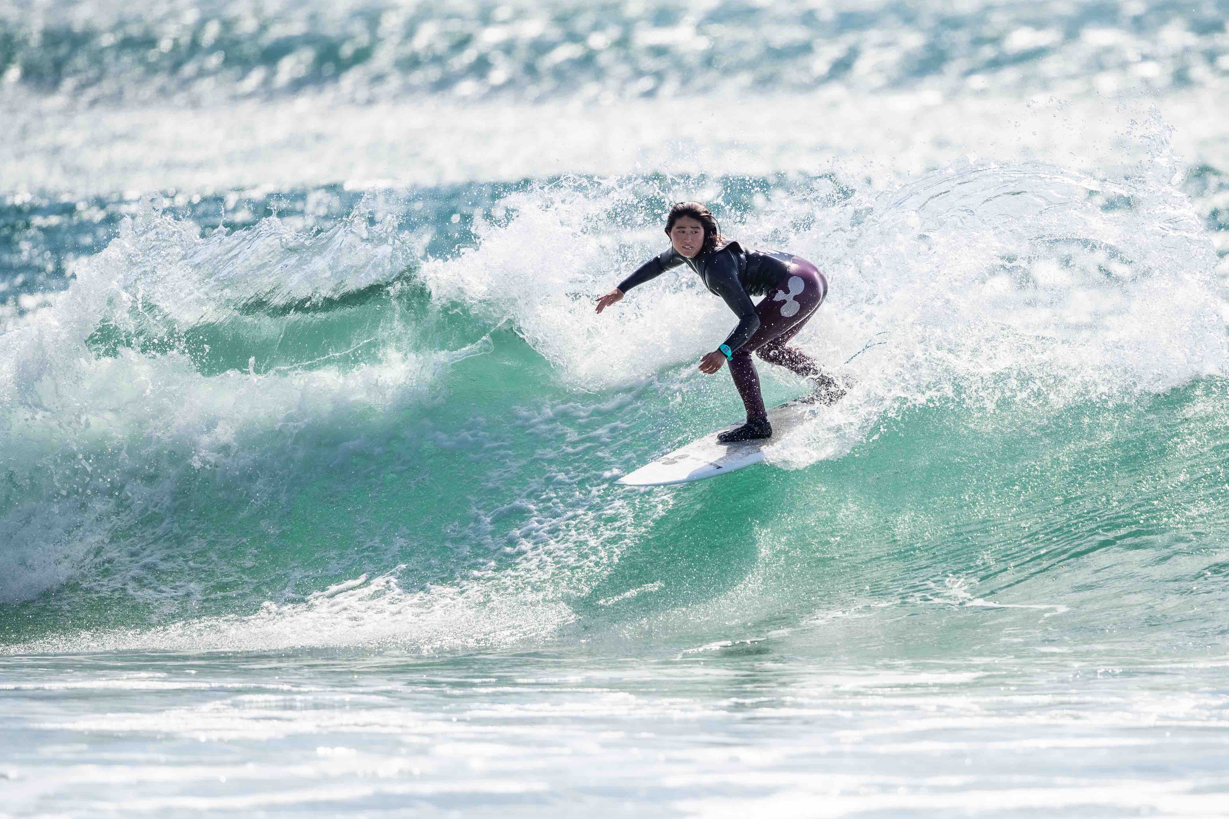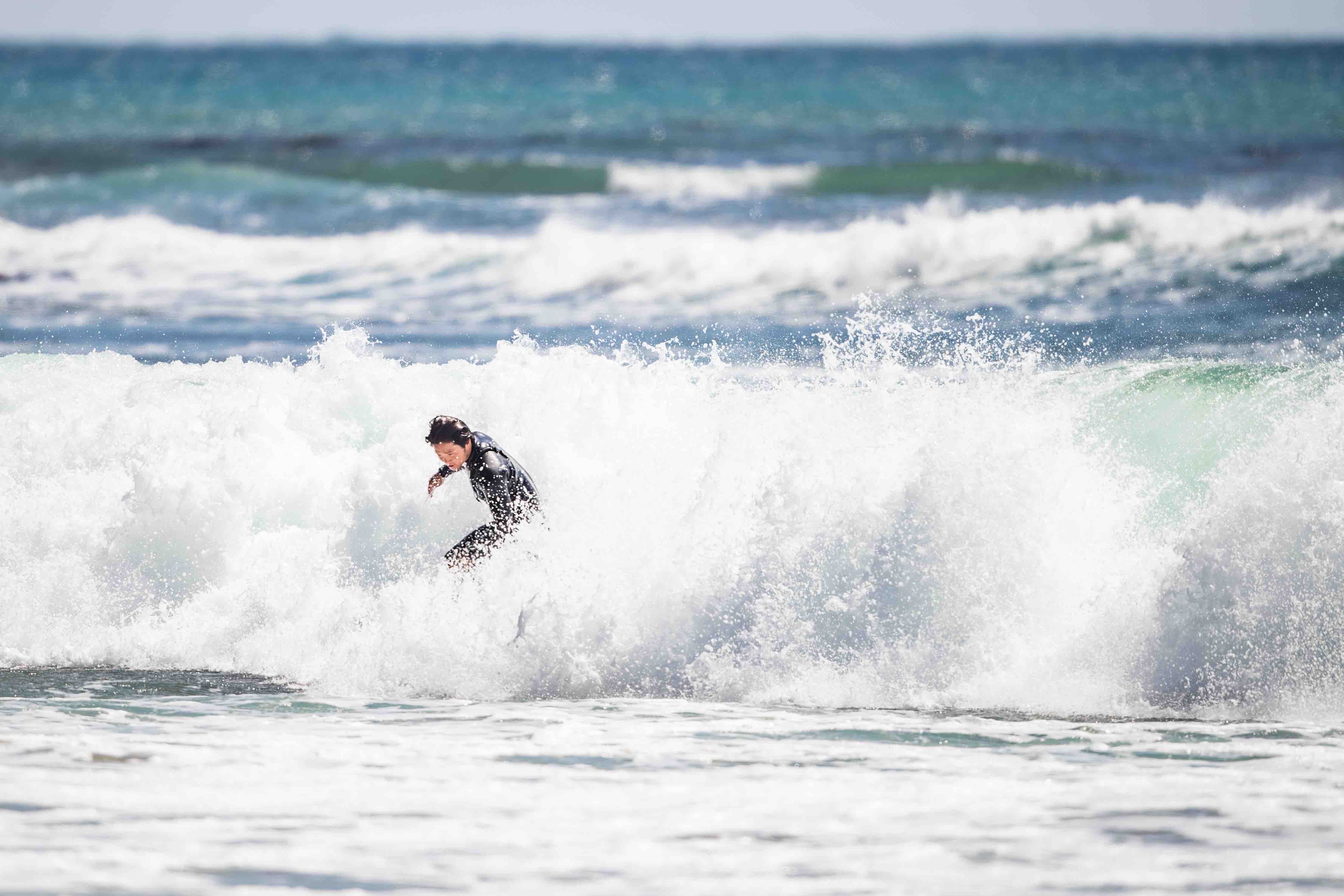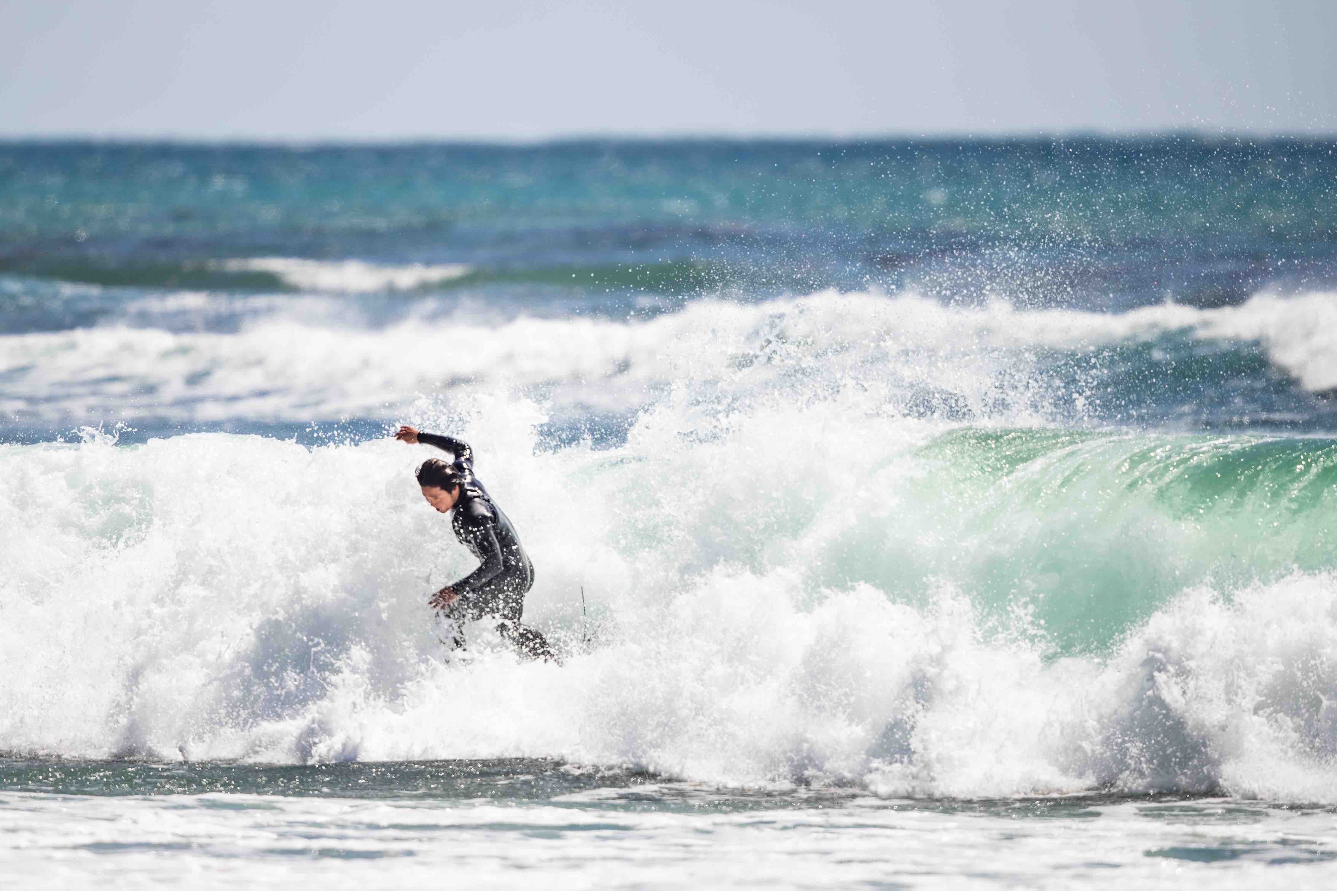 このエリアを拠点とする女子高生プロサーファー松永莉奈。狂気のビッグウェイブ・チャージぶりで日本のビッグウェイブシーンを揺るがす松永大輝プロの妹でもある。トップで大きなスプレーを上げることができるのは、持ち前の深いボトムターンがあってこそ。Rina matsunaga.