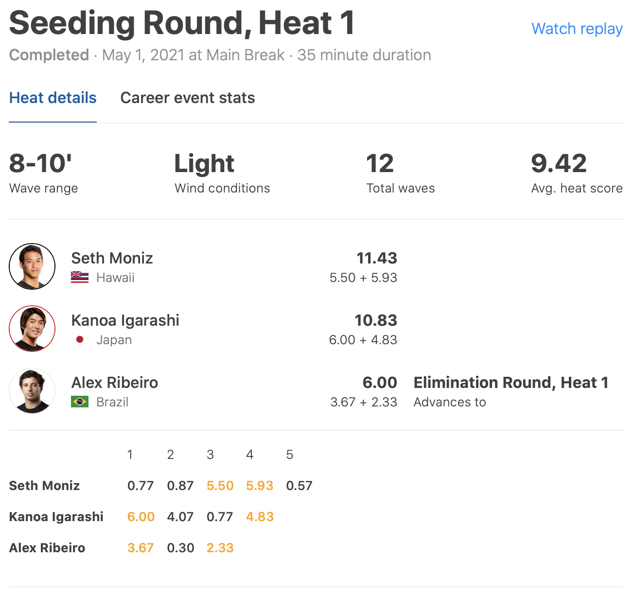 MENSラウンド1ではヒート1に注目の五十嵐カノアがSeth MonizとAlex Ribeiroと対戦。