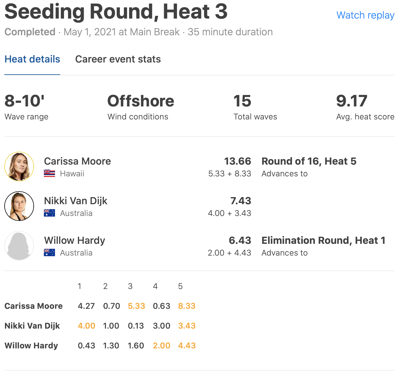 さらにヒート3ではワールドチャンプCarissa Mooreが8.33ptのエクセレントスコアを叩き出して、さすがハワイアンこのサイズになると本領発揮といったパフォーマンスを見せつけてくれた。