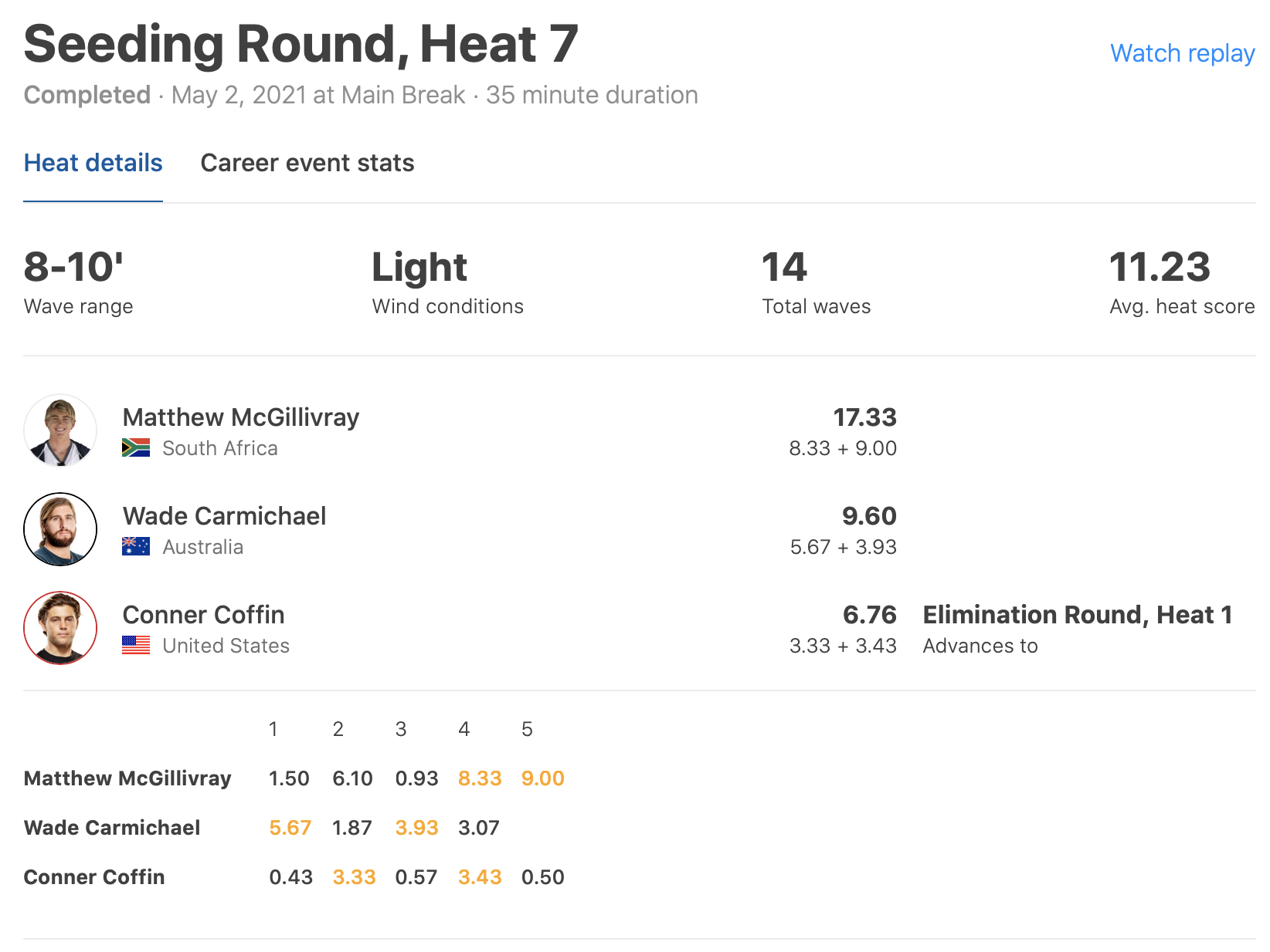 ヒート7では南アフリカ出身のCTルーキーMatthew McGillivrayが8.33ptと9.00ptのエクセレントスコア2本をまとめ、17.33ptという驚異的なトータルスコアを叩き出し、Wade CarmichaelとConner Coffinを抑えて見事1位でラウンドアップを果たした。