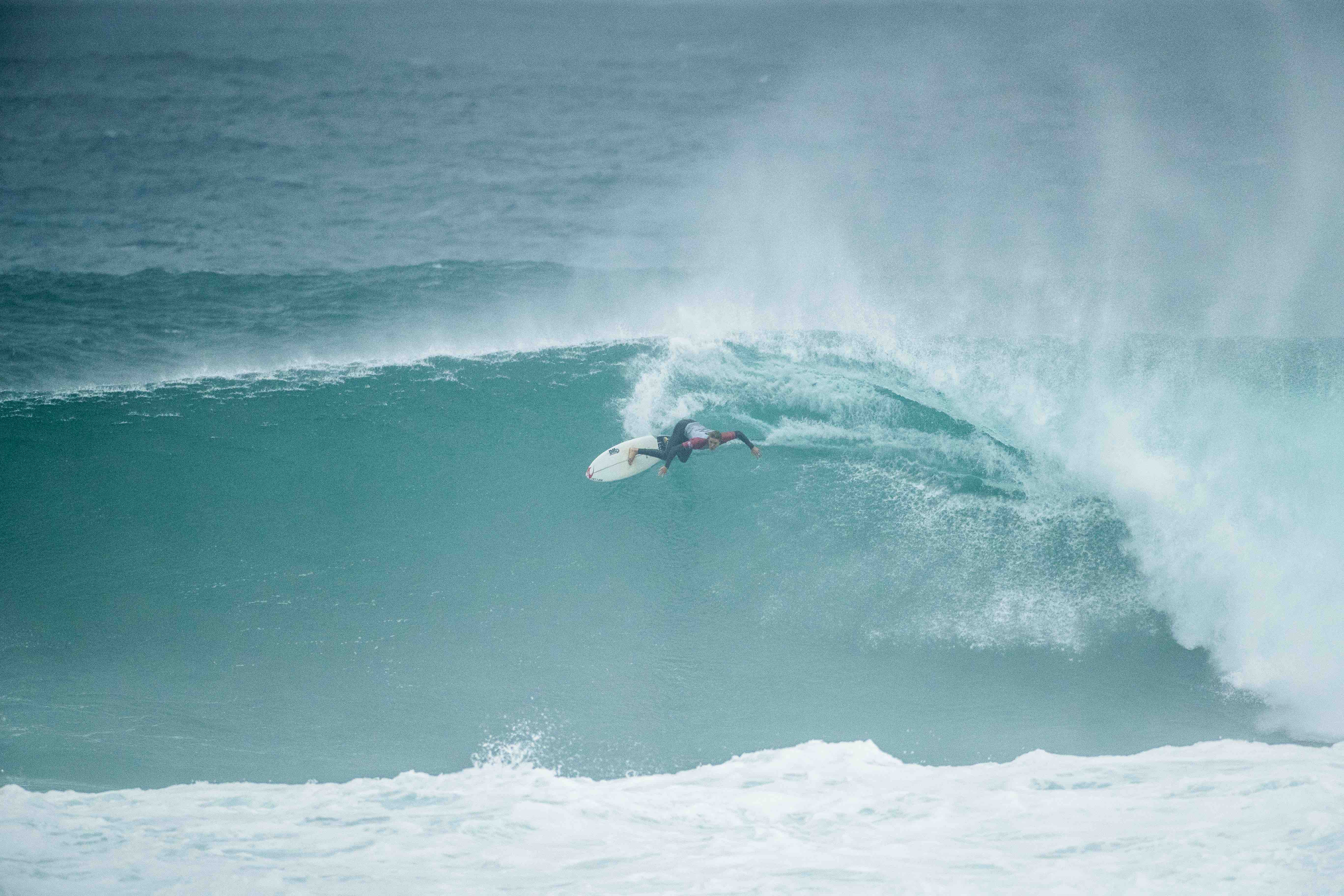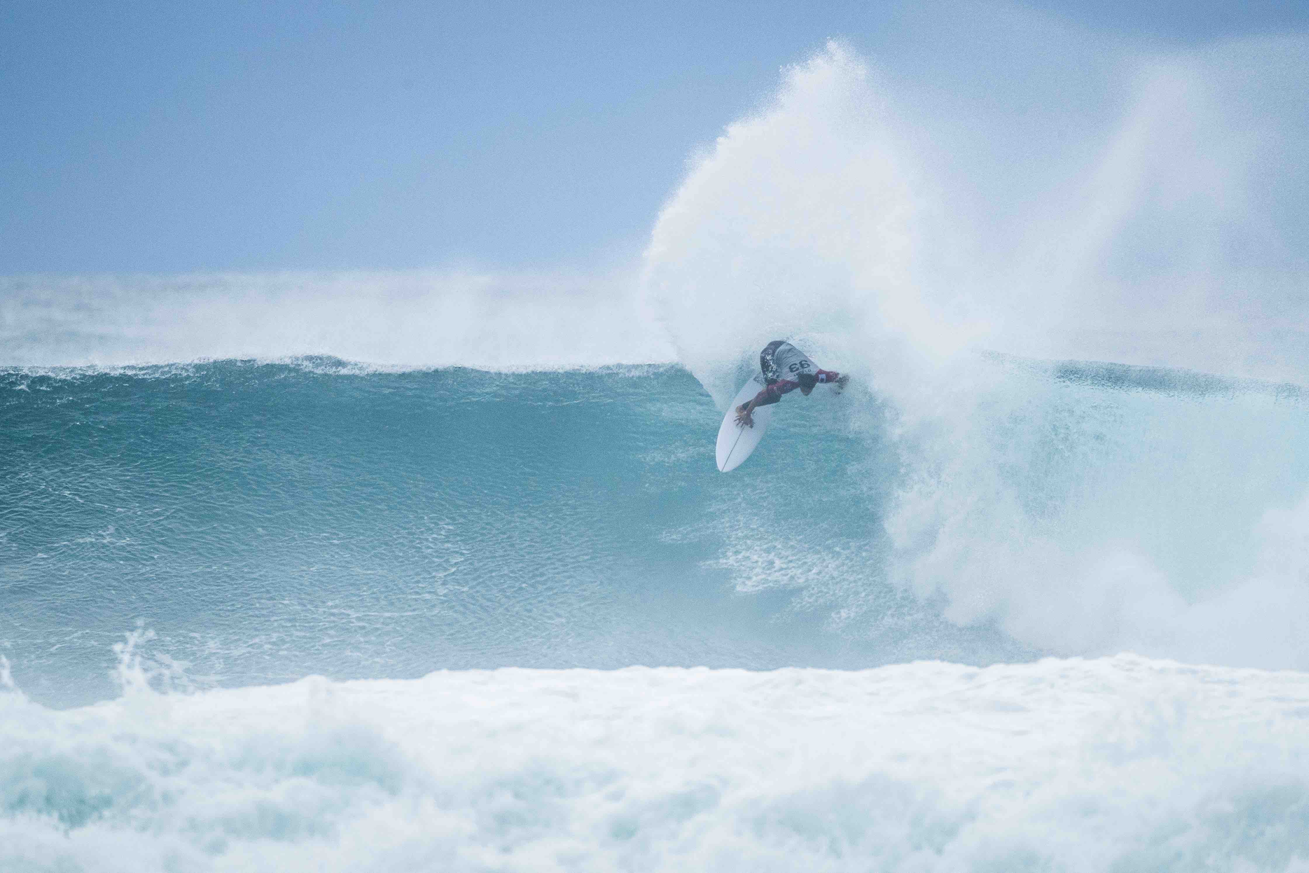 Michel Bourez、Mikey Wrightを相手に長く、深いチューブからのパワフルかつしなやかなレイバック・リエントリーを決め、今シーズンのCT初となる10ptを叩き出して会場を興奮の坩堝に陥れた。