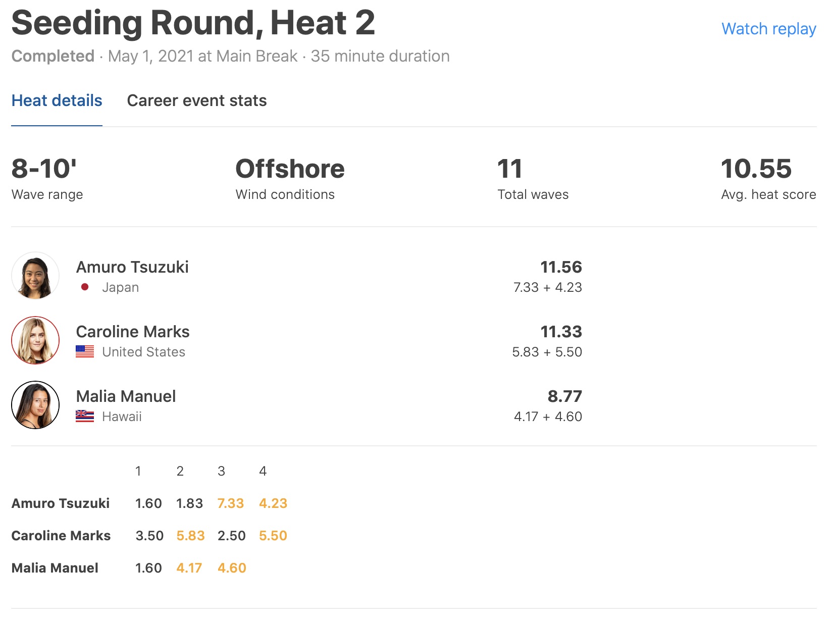 WOMENSのラウンド1のヒート2では、すでに速報としてお伝えさせて頂いた通り、都筑有夢路がバックサイドで7.66ptのグッドスコアをマークしてCaroline MarksとMalia Manuelを抑えて見事ラウンド3進出!