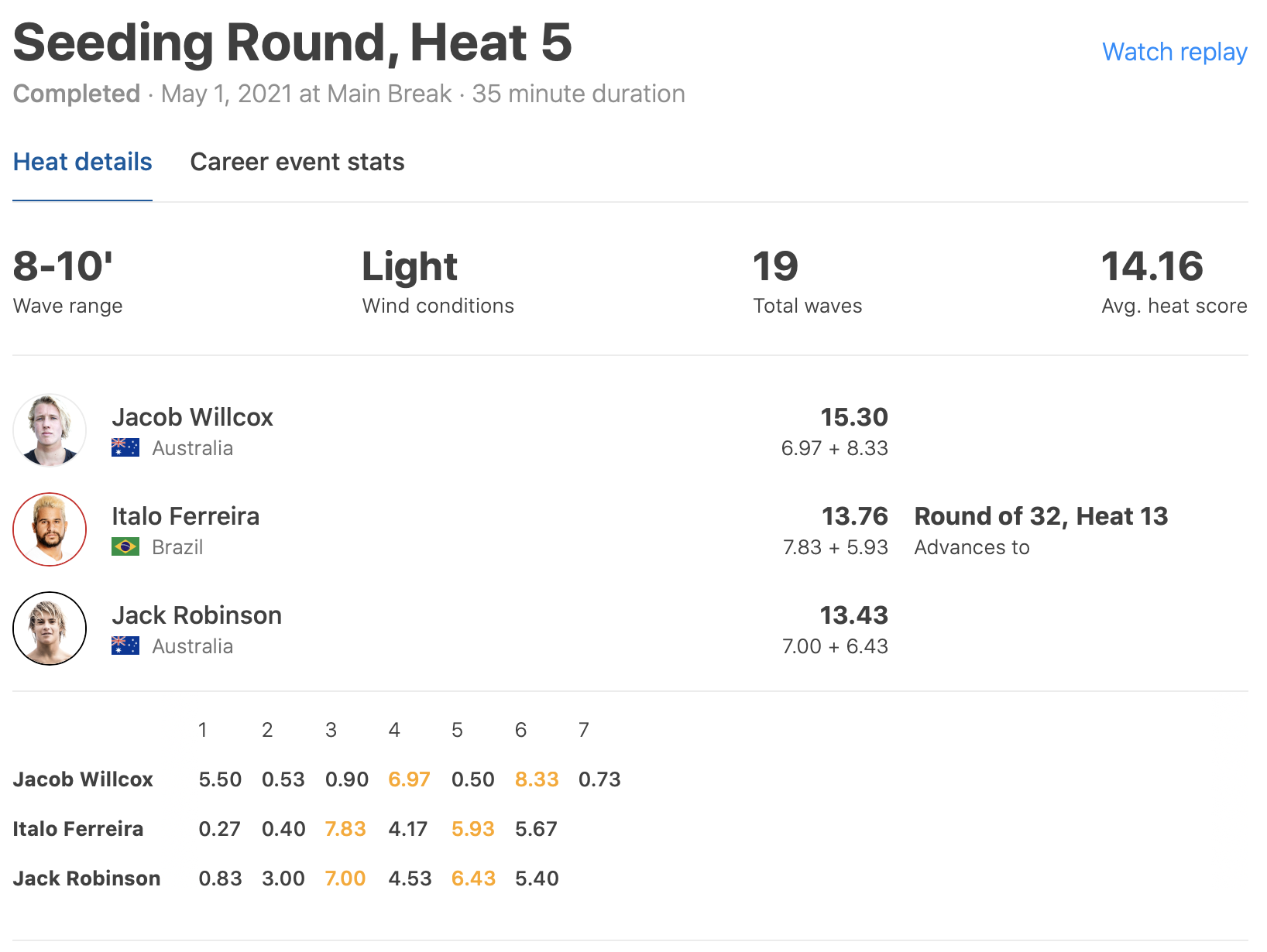 さらにヒート5ではワールドチャンプItalo Ferriraとウエスタン・オーストラリア出身で世界指折りのビッグウェイブ・スキルを持つと言って過言ではないJack Robinsonを相手に、ワイルドカードで出場のJaacob Wilcoxがトータルスコア15.30ptを叩き出し、ダントツの1位でラウンドアップ!!