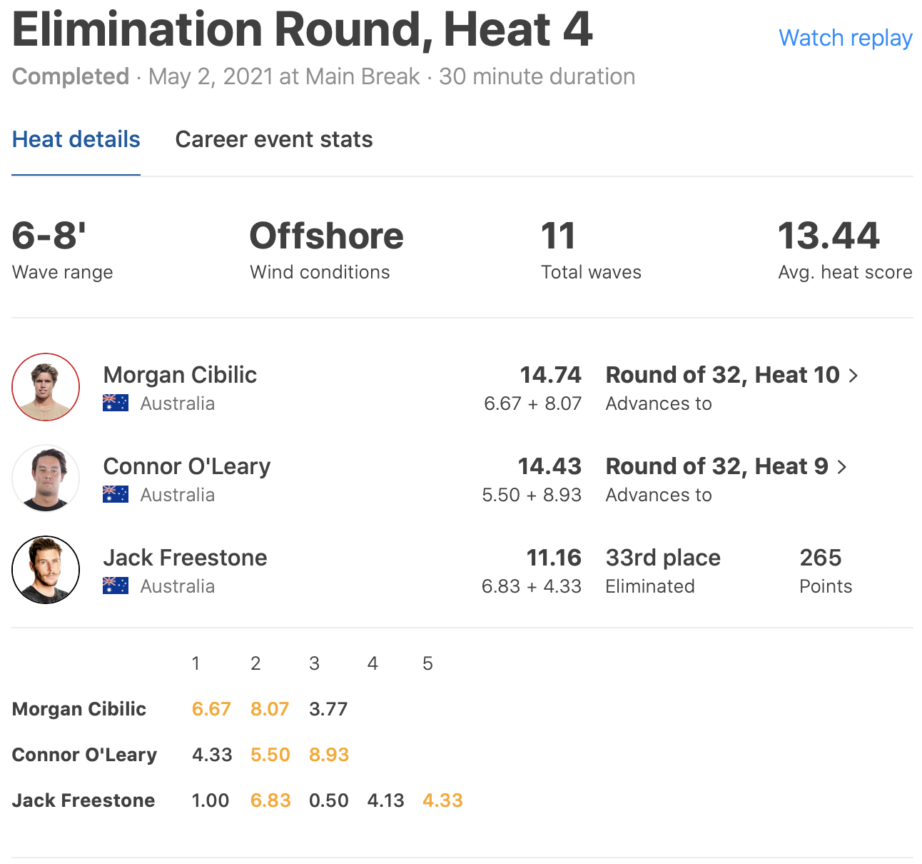 コンテストDAY1に行われたラウンド1となるシーディングラウンドで3位となった歴代グランドチャンプ唐沢明美プロの息子Connor O’learyは、、敗者復活戦となるイリミネーション・ラウンドのヒート4でCTルーキーのMorgan CibilicとJack Freestoneと対戦。
