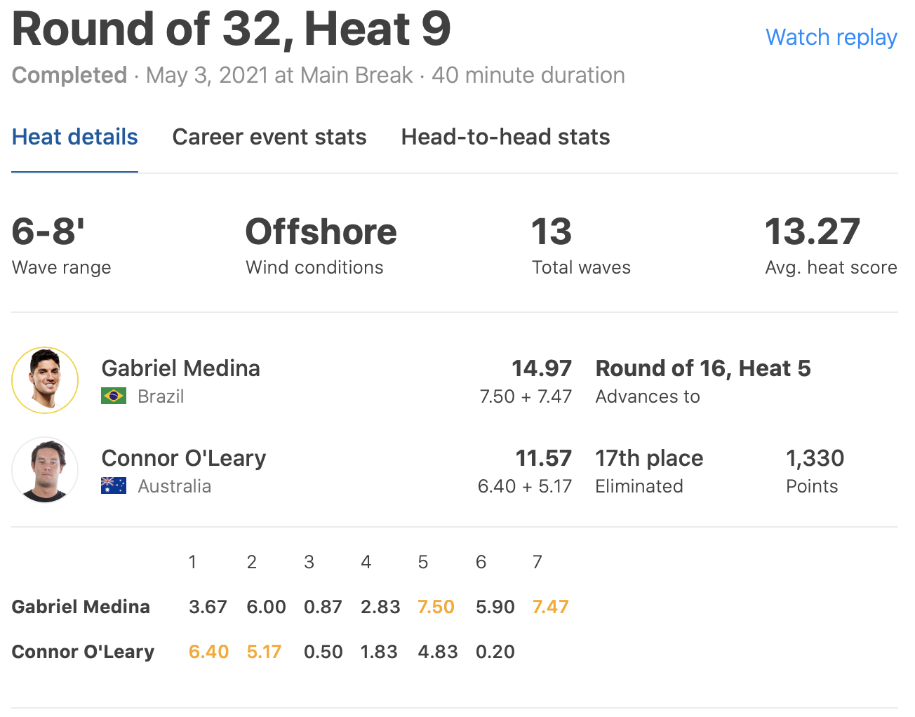 迎えたラウンドオブ32のヒート9ではワールドチャンプGabriel Medinaと対戦。