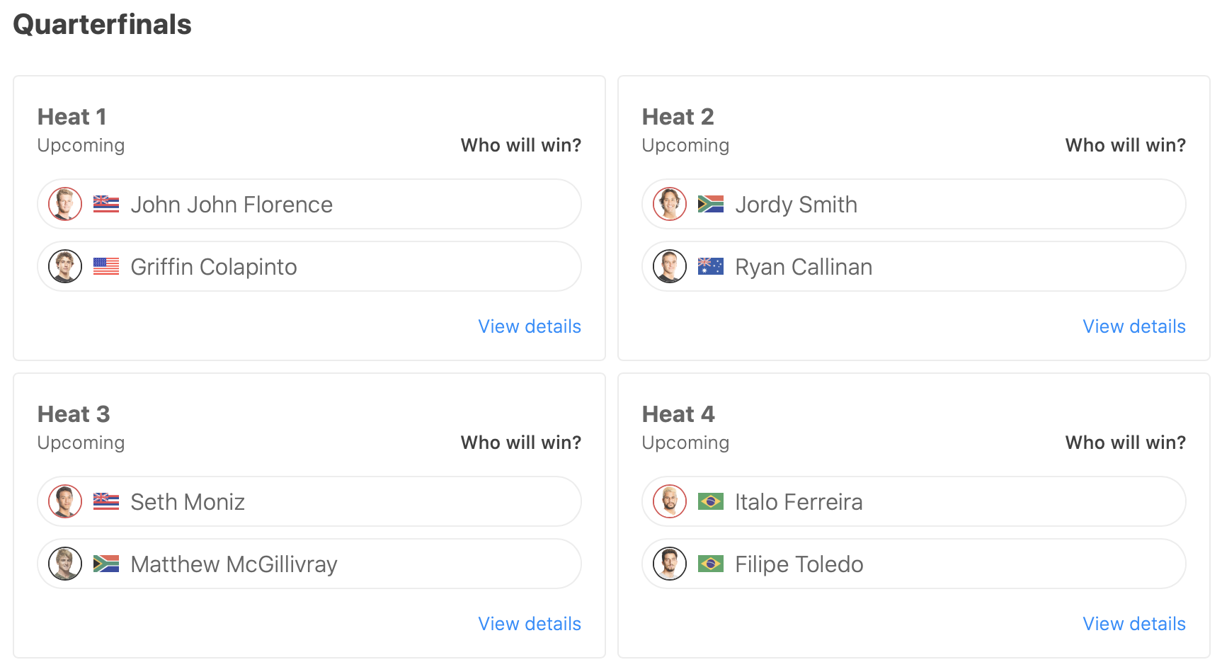 しかしその裏のセットを掴んでいたMatthew McGillivrayが2発のビッグターンで6.00pt、さらにその後掴んだ10本目の波で6.77ptとさらにスコアを伸ばし、逆転返しを食らう流れとなってしまい、惜しくもここで敗退。
