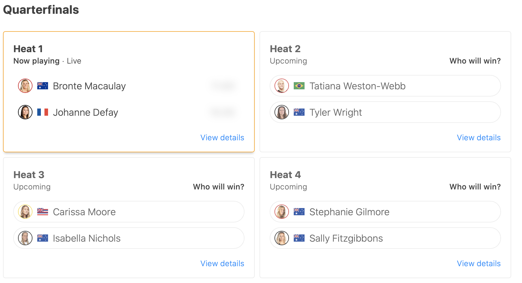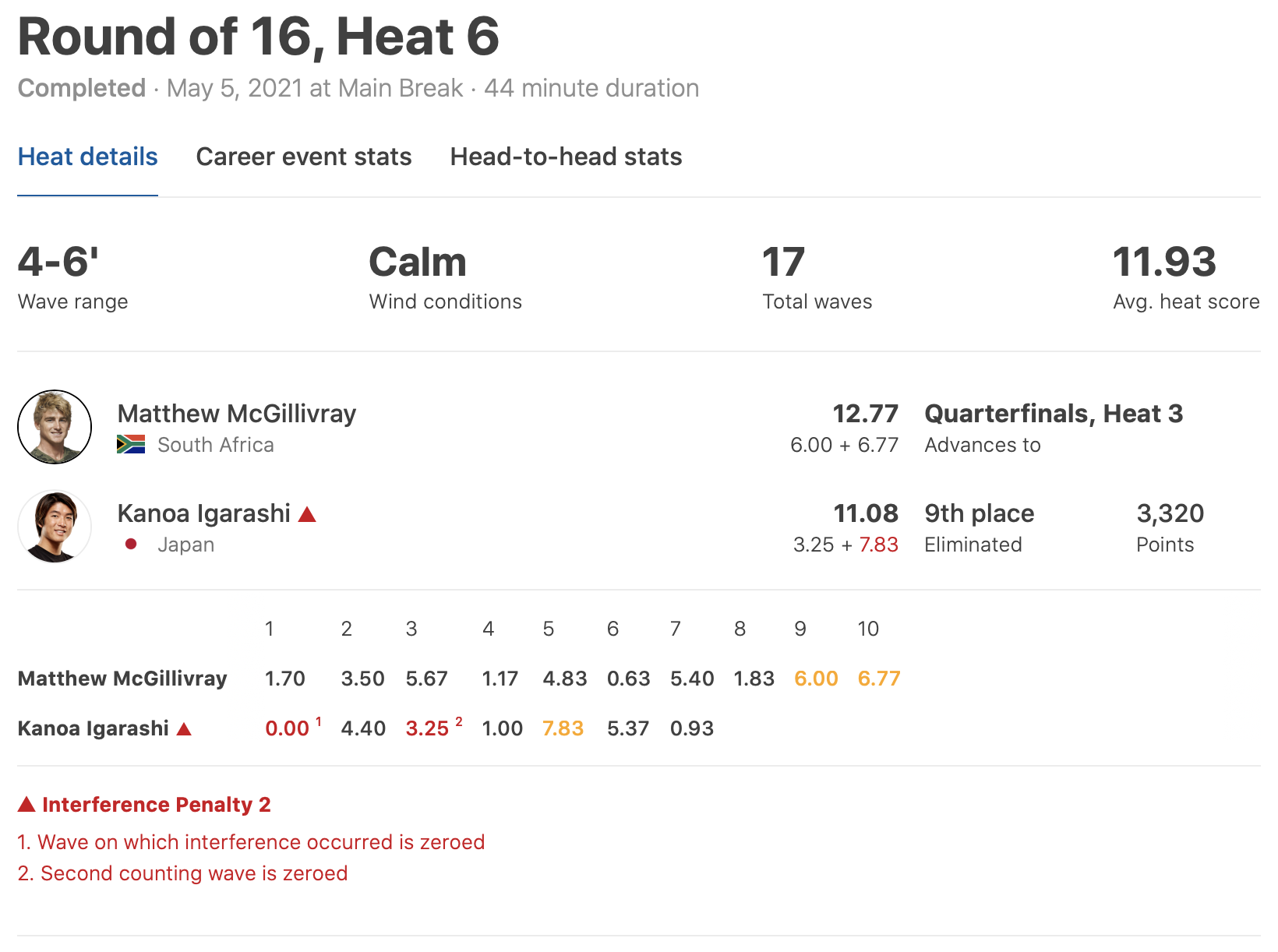 1本目の波からMatthew McGivillivrayに対してインターフェアを犯してしまう痛恨のミスを犯してしまい、3本目に6.50ptをスコアするものの、インターフェアによってベスト2ウェイブのうちのバックアップスコアが半分となってしまうため、逆転に必要なスコア7.25ptという厳しい状況に追い込まれてしまう。