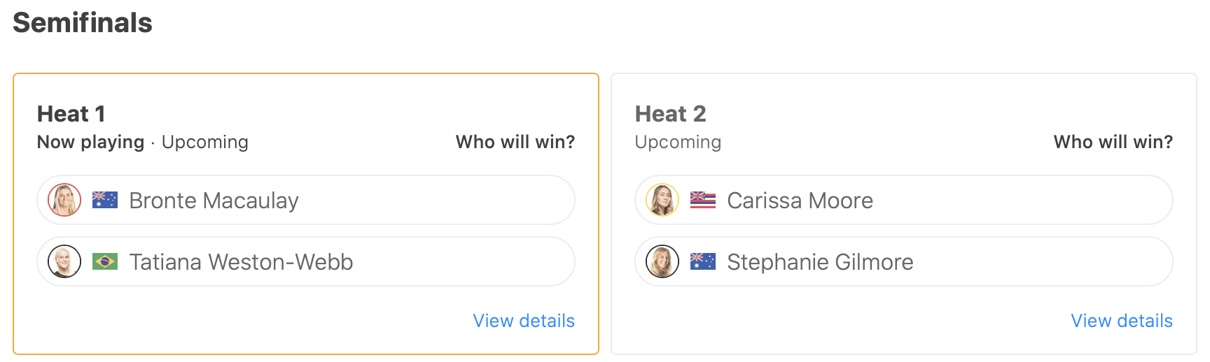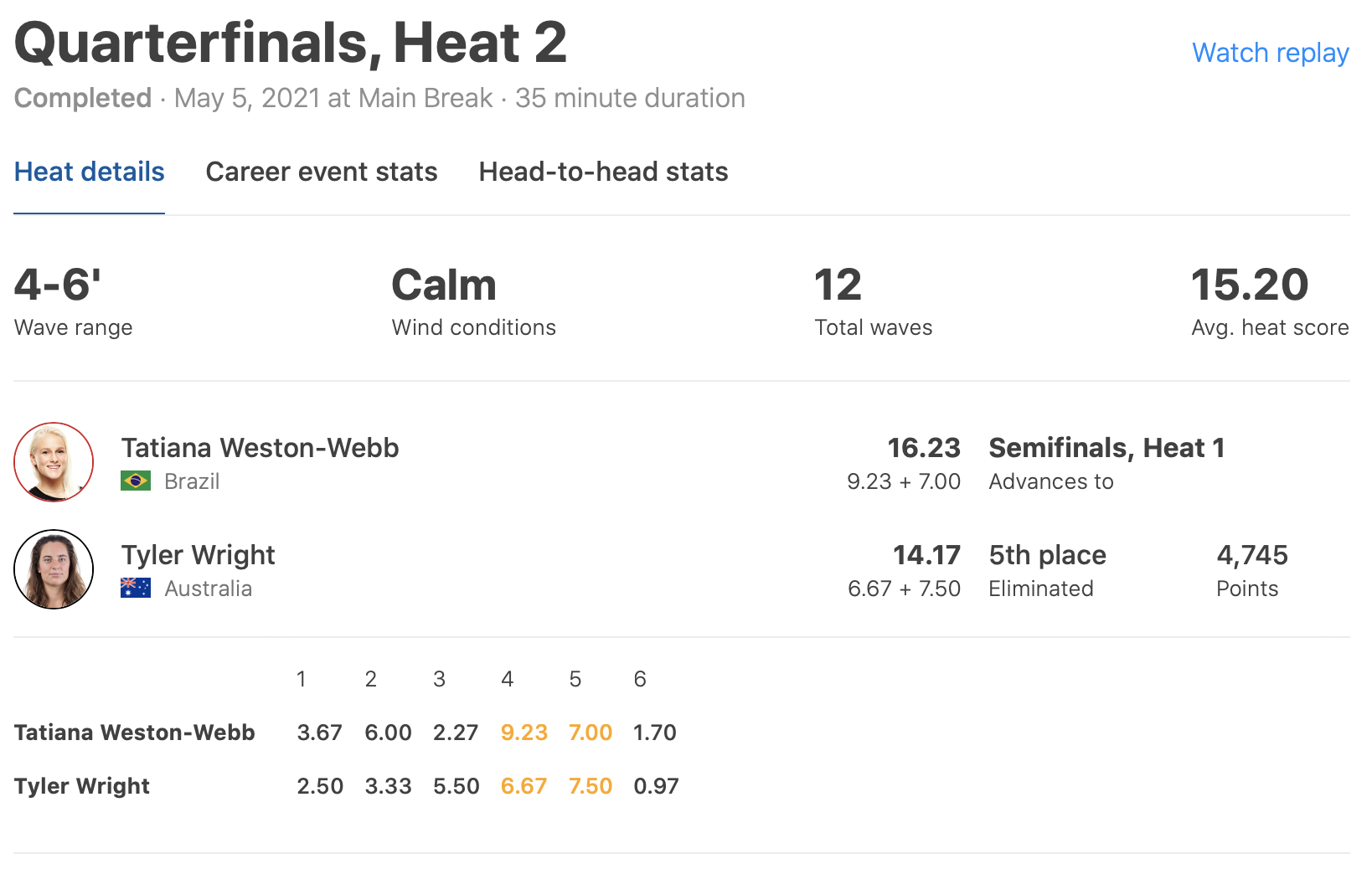 その一方でヒート3に登場したCarissa Mooreとヒート4で9.50ptを叩き出したStephanie Gilmoreといった2名のワールドチャンプは順当にセミファイナルへと駒を進めた。