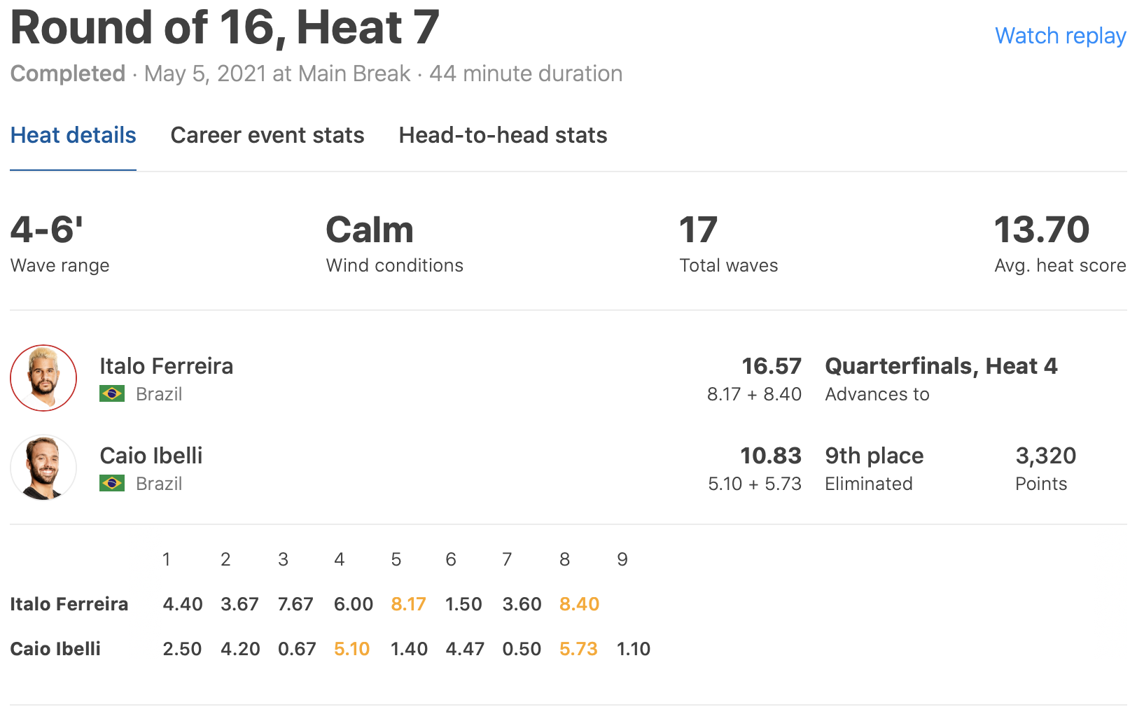 その一方で、ヒート7ではワールドチャンプItalo Ferreiraがバックサイドエアからパワフルなリップまで飛び出す大炸裂となり、この日のベスト・トータルスコアとなる16.57ptを叩き出してその強さを見せつけた。