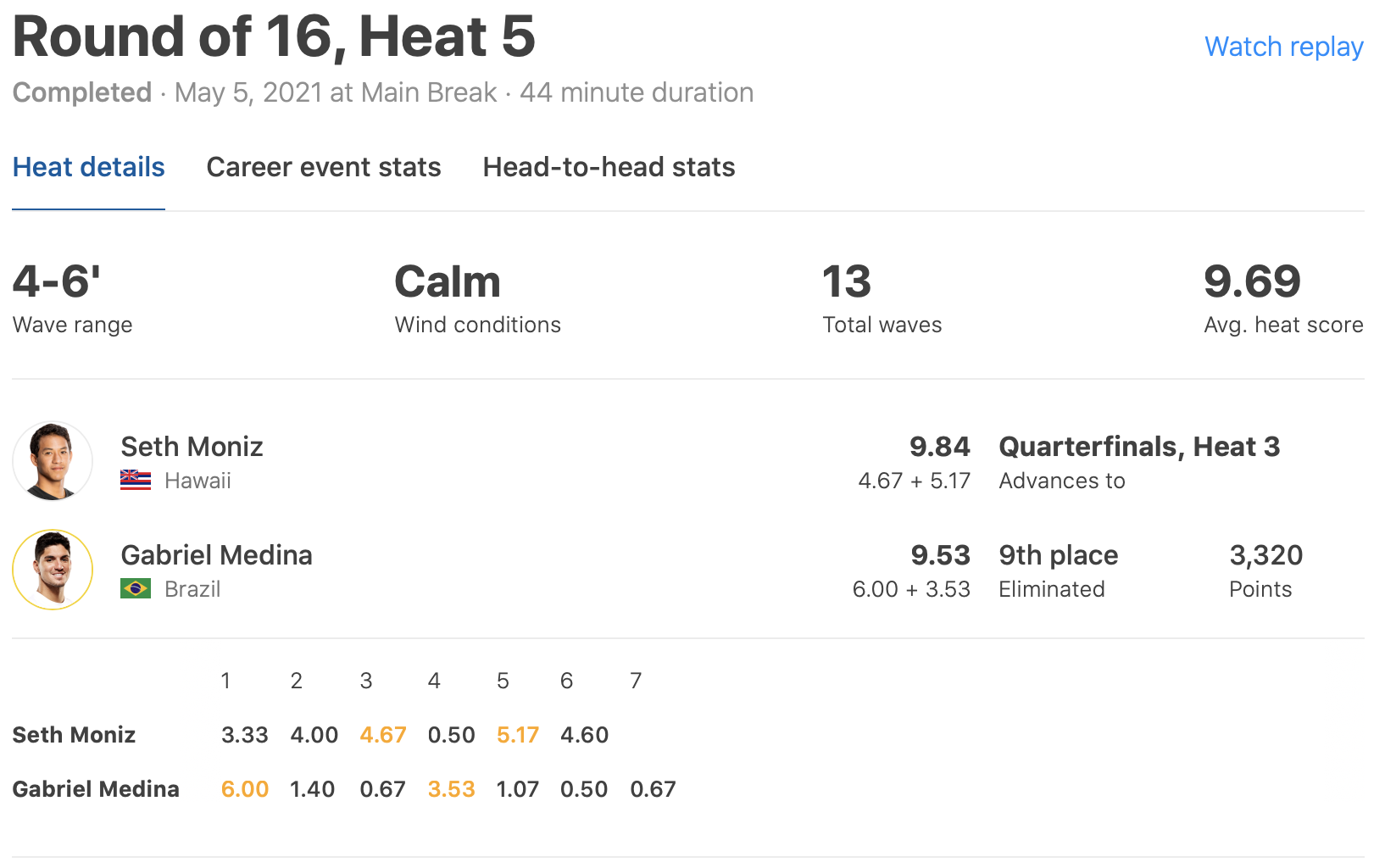 注目の五十嵐カノアは痛恨のインターフェアによって9位で今大会を終えたことについてはすでに速報としてお伝えした通りであるが、さらにMENSラウンドオブ16で特筆すべきはヒート5でSeth MonizがワールドチャンプGabriel Medinaを下す大波乱が巻き起こったこと。