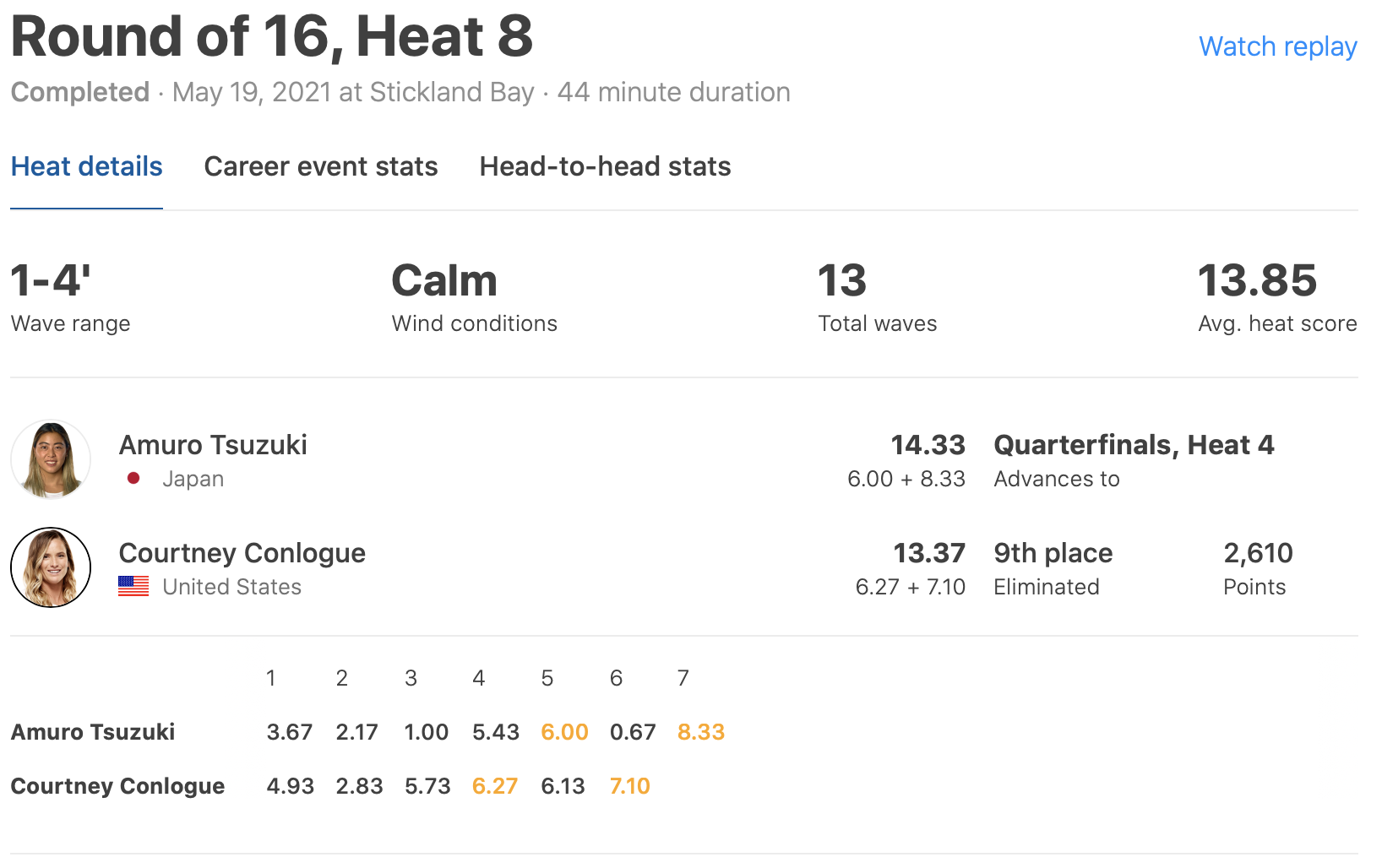 注目の都筑有夢路はラウンドオブ16のヒート8でCourtney Conlogueと対戦。