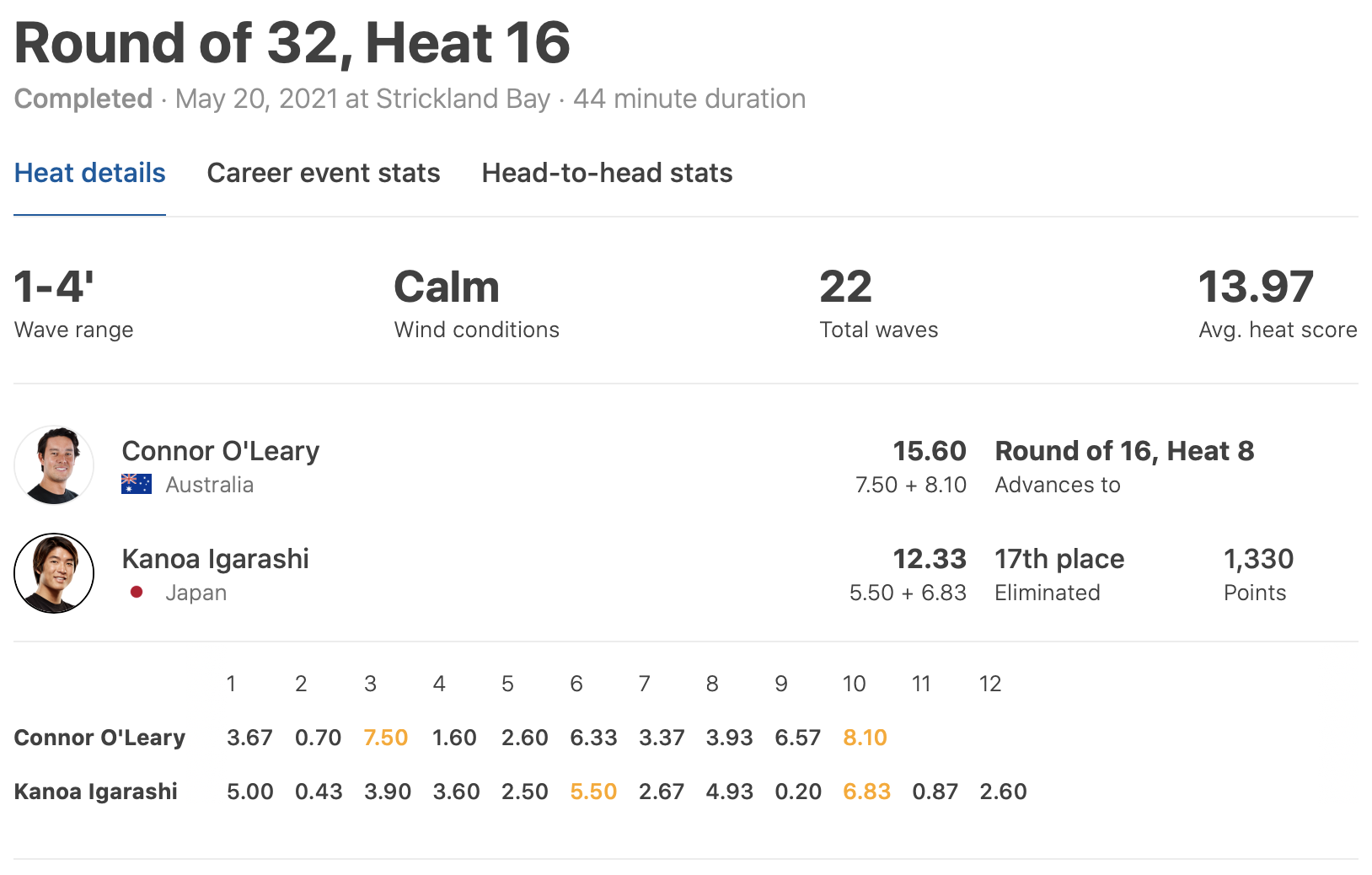 日の丸を背負って戦うこの2名が戦うという日本人ファンにとっては辛い状況の中、7.50ptをバックアップに、10本目の波では8.10ptのエクセレント・スコアを叩き出したConnor O’learyが見事ラウンドオブ16進出を決めた!