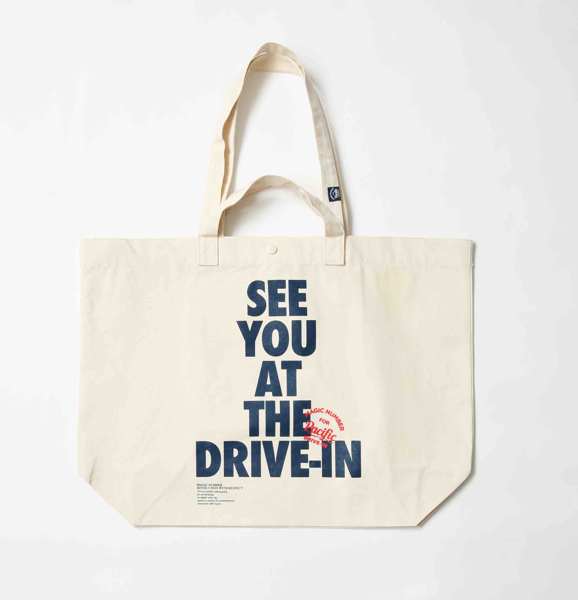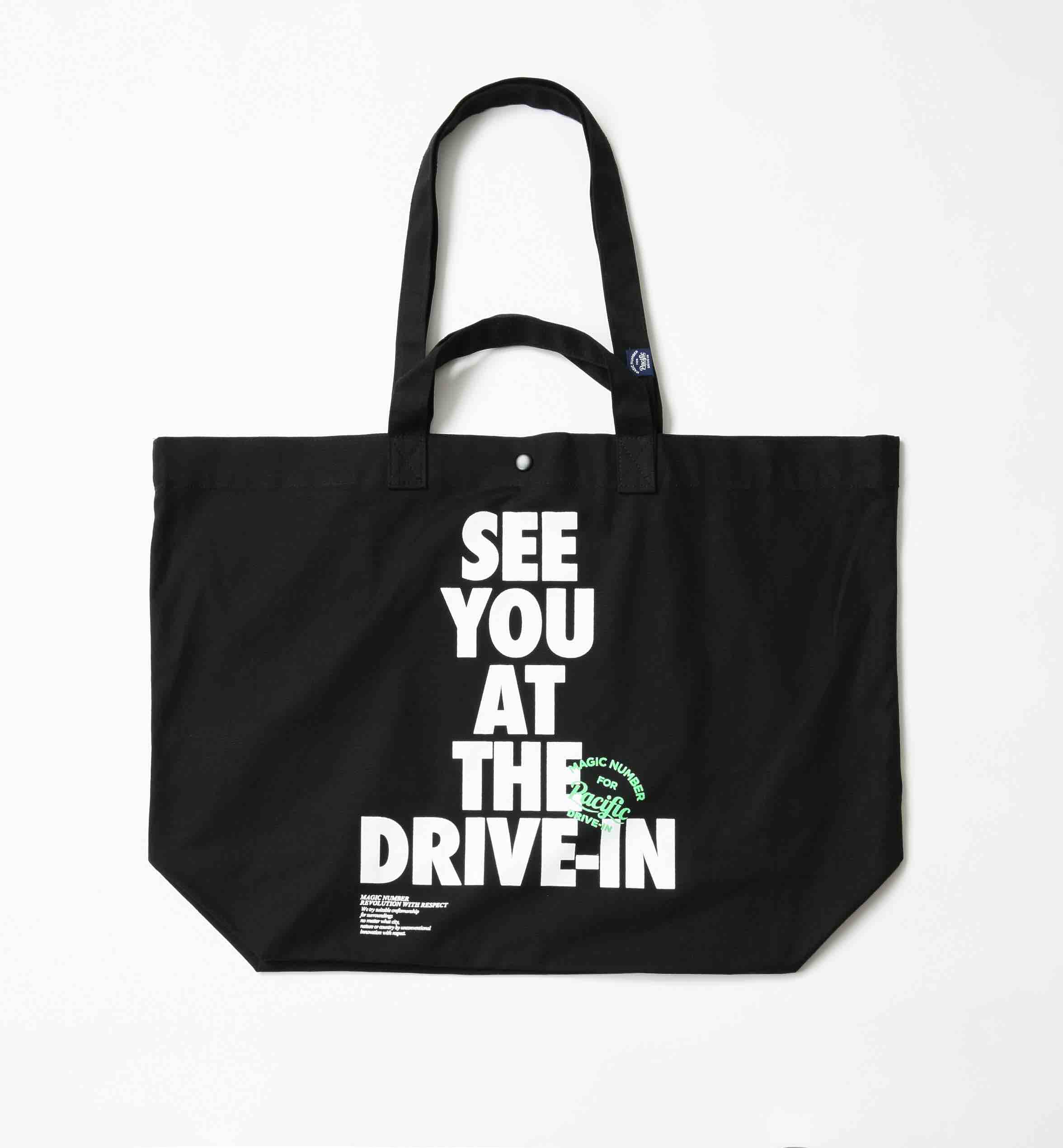 程よい厚みのコットンキャンバスを使用した大きめサイズのトートバッグ。2種類の長さのストラップが付いており、手持ちでも肩掛けでも使える2WAY仕様で使い勝手の良いデザインに。キャッチーなカラーで大胆にプリントされた”SEE YOU AT THE DRIVE-IN”のプリントが印象的。さり気なくストラップに付けられたコラボレーション用のネームもポイント。