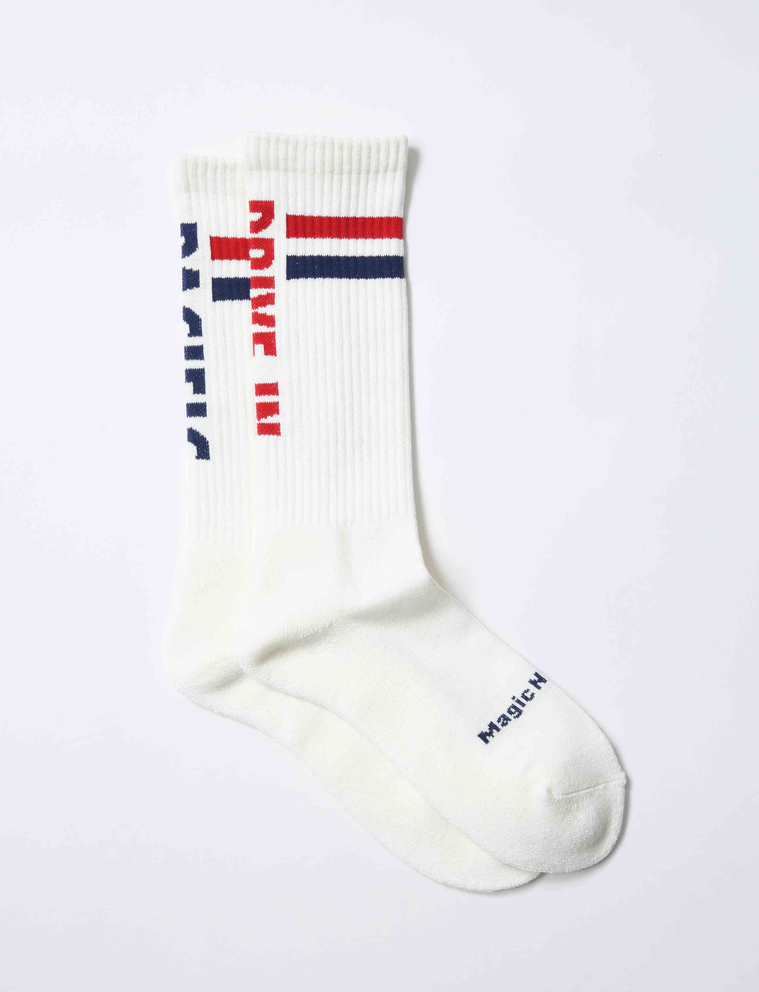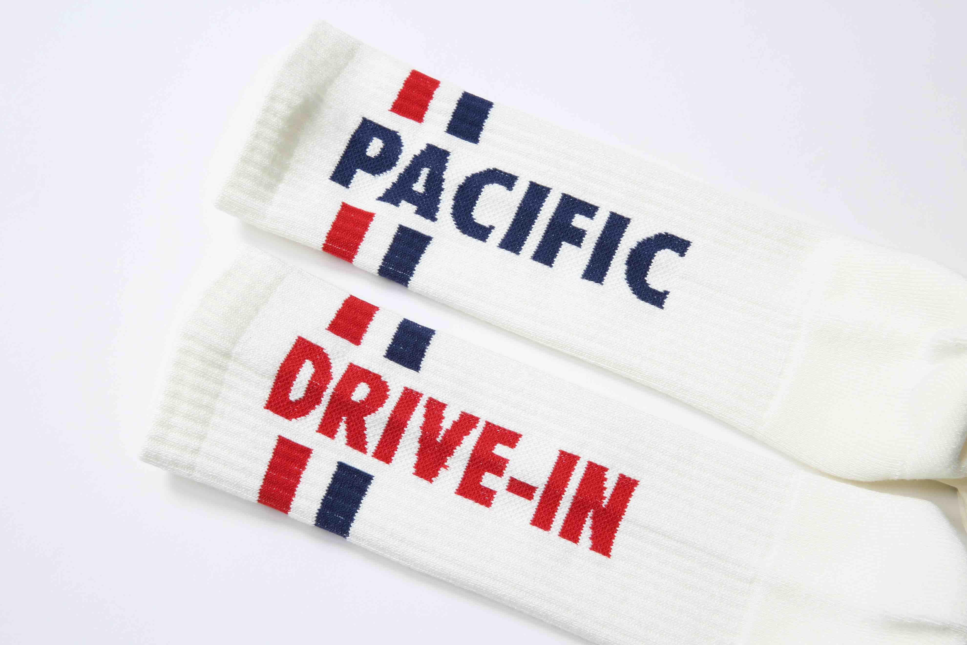 MAGIC NUMBERオリジナルの肉厚のソックスをコラボレーション用にアレンジ。片方にはPACIFIC、もう片方にはDRIVE-INのロゴが入っており、ポップなトリコロールカラーで、映える事間違いナシ。ビンテージの編機で編立てた耐久性の高い編地は、アクティブなシーンでの使用にも耐えられる。抗菌防臭加工を施した糸を使用し、衛生面も◎。
