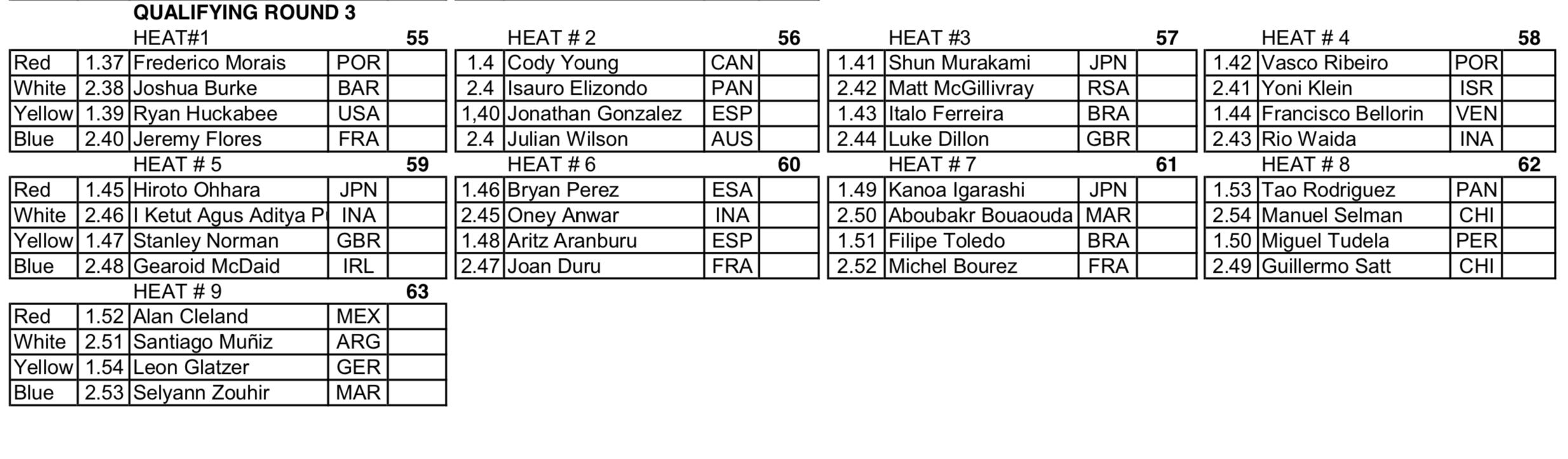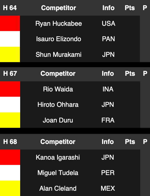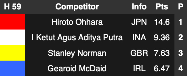 日本代表の村上舜、大原洋人、都筑有夢路、松田詩野、前田マヒナは、大会初日R1のHeatを1位通過でラウンドアップ、大会2日目はR1.Heat24 五十嵐カノアの試合から開始、見事1位通過で五輪代表を確定させ、R2も1位通過でR3へ進む。