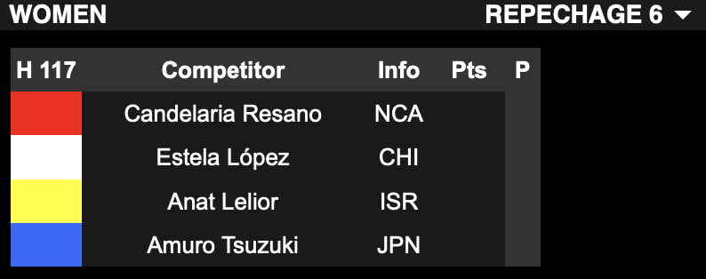 次に組み込まれたリパチャージラウンド6ではヒート1でCandelaria Resano、Estela Lopez、Anat Leilorと対戦予定。