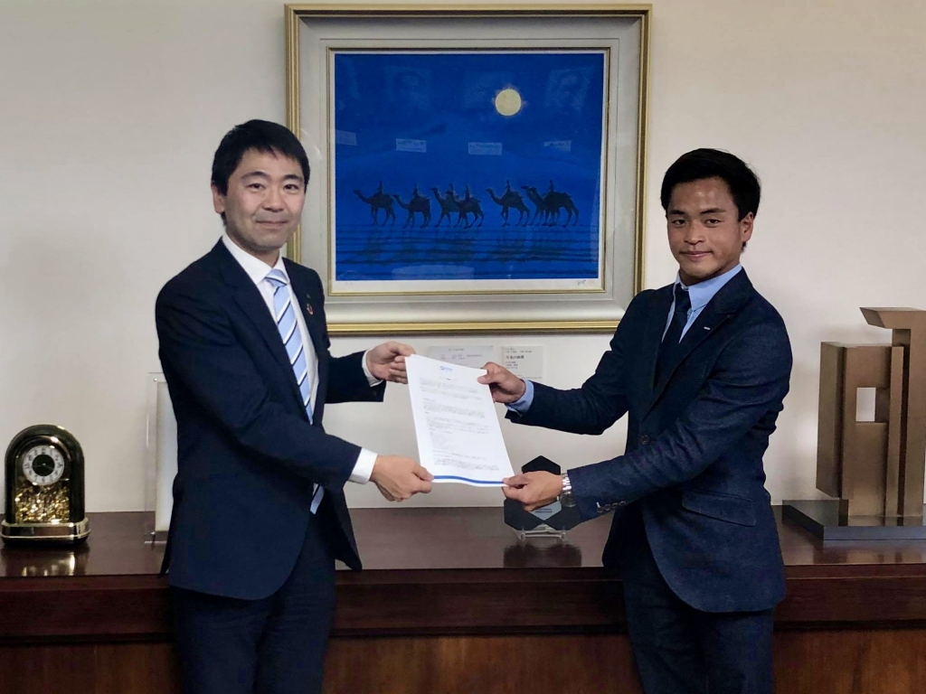 世界の優れたサーフポイントの環境を保護し持続させる「サーフィン保護区」の要望書を鎌倉市長に手渡した石川。行政や企業とのリンクが大切と考えている。