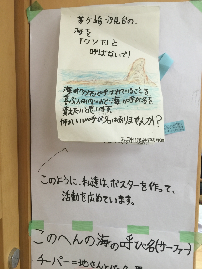 はい。小学校の前のサーフポイントは「クソ下」という通称で呼ばれているんですが、その名前を変えようという運動です。自分達が生まれる以前の昔は、汚水が直接海へ排出されていたらしく、今でもそう呼ばれていますが、現在では下水が整備されて雨水しか流れてきません。そもそも、正式名称は「汐見台海岸」と言うんです。