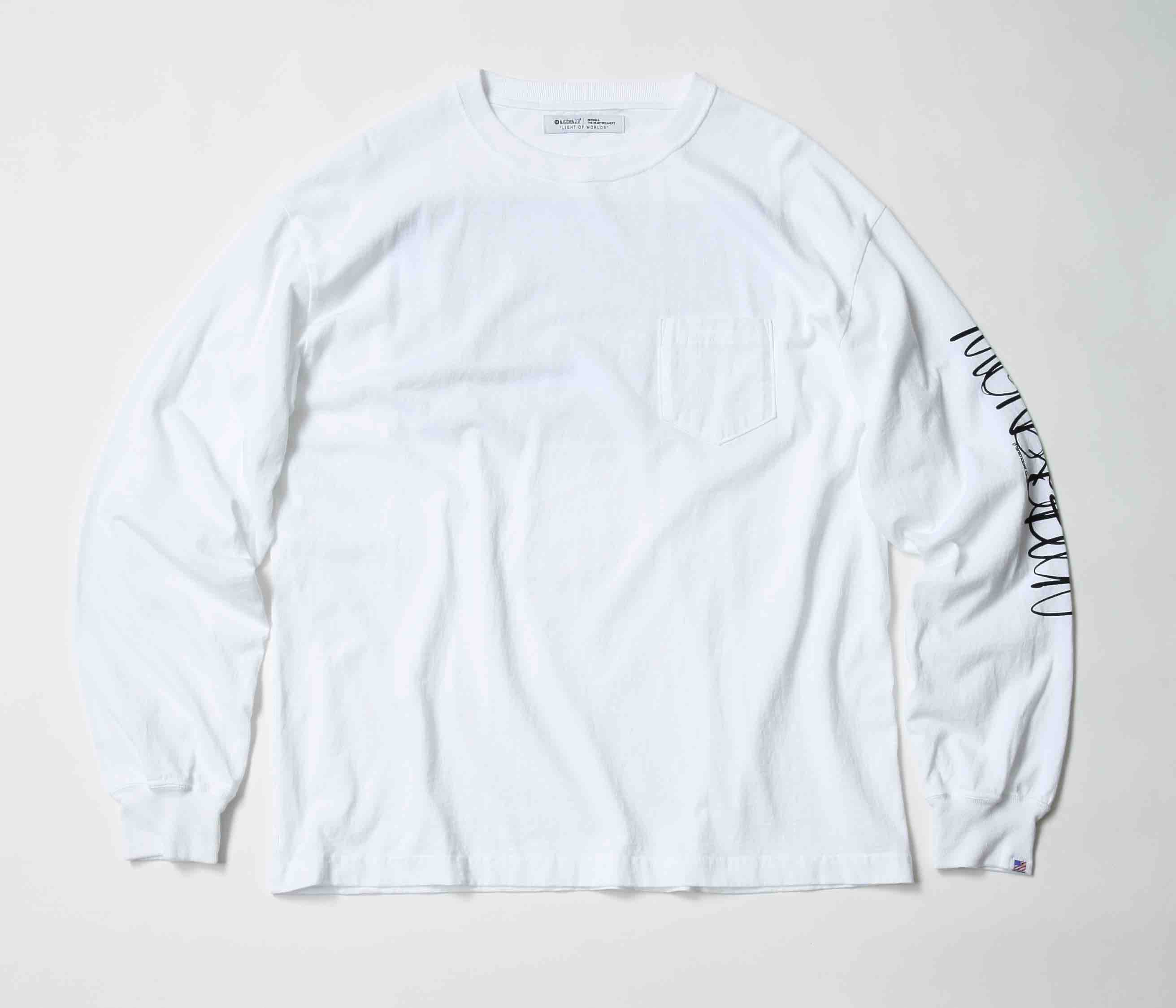 凹凸感のある独特な風合いが魅力のUSコットンを使用したL/S Tシャツ。左袖には今回のコンセプト を象徴するペンライトアートをモチーフにしたプリントで90sのストリート感を表現。 バックには国道134号線から見える朝焼けと街のネオンを表現したグラフィックがストーリーを 感じさせるデザインに。仕上げにガーメントウォッシュを施し、適度にこなれた雰囲気も魅力。 コラボレーション用に作られたオリジナルのネームラベルがコラボレーションをさり気なく主張 している。