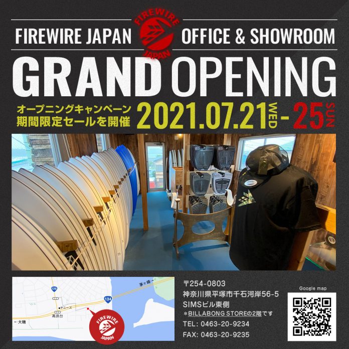 世界最先端のマテリアルと世界一流シェイパーたちの技術を高次元で融合させたレベルを問わない高性能な乗り味で世界中のサーファーたちを虜にし続けるFIREWIRE surfboardsのショールームが、7/21(水)より神奈川県平塚市千石河岸56-5 SIMSビル東側2Fに移転したことを祝し、7/25(日)までの期間限定で特別感謝セールを開催することが決定!!