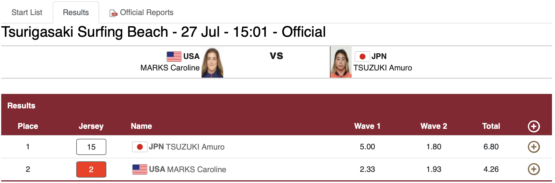 都筑有夢路とCaroline Marksによる銅メダル決定戦は両選手ともにどれがいい波なのか予測不可能に近いトリッキーなコンディションに翻弄されながらも、都筑有夢路が3本目に掴んだ波でリスキーなエンドセクションに対するパワフルなリップたった1発で5.00ptをマーク!