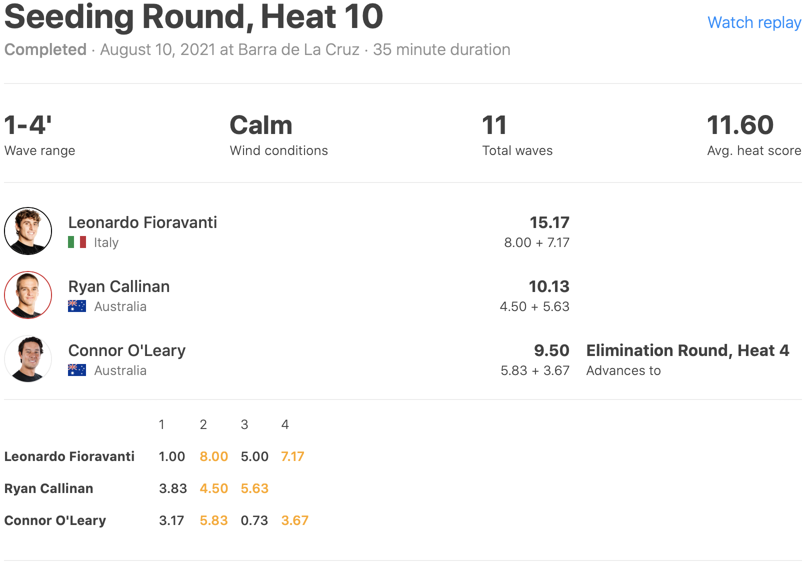2本目の波から8.00ptのエクセレントスコアを叩き出し、4本目には7.17ptと、トータルスコア15.17ptをマークしたLeonardo Fioravantiがダントツのリードをはかる中、4.50ptと5.63ptをまとめたRyan Callinanとの2位争いとなったConnor O’learyであったが惜しくも逆転ならず、敗者復活戦となるラウンド2進出となった。
