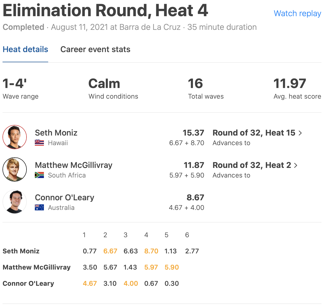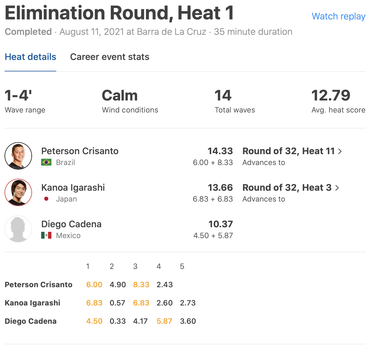 迎えたラウンドオブ32のヒート3ではKolohe Andinoとの対戦となったが、思うようなライディングを決めることができず惜しくもここで敗退。