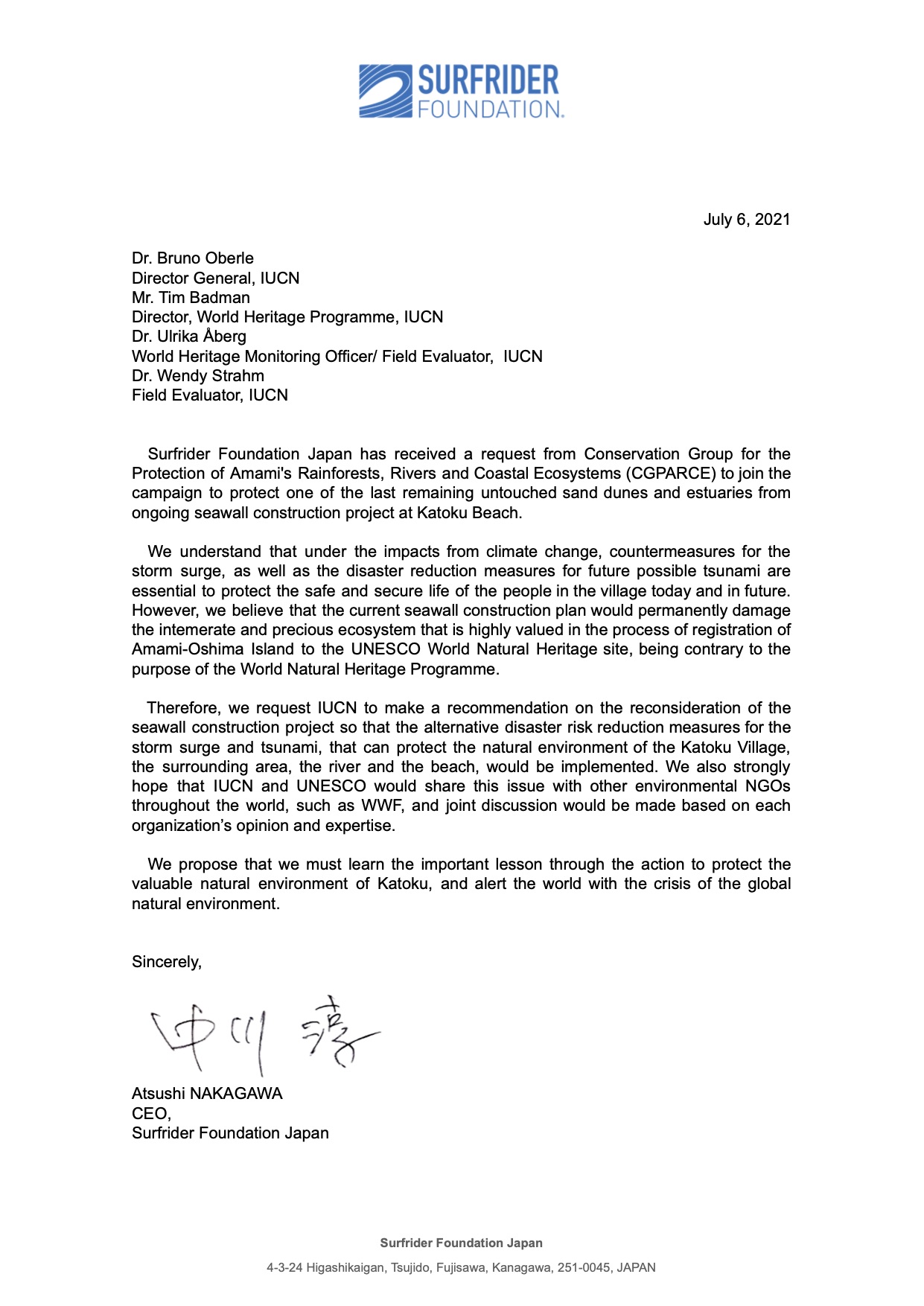 世界自然遺産の登録によって保護、保全しようとしている嘉徳浜の自然資源と手付かずの完全なるエコシステムに対する脅威となるこの護岸建設を阻止するべく、サーフライダーファウンデーション・ジャパンが、Save The Waves Coalitionと連携し、”奄美の森と川と海岸を守る会”が現地で行なう奄美大島・嘉徳浜の保全活動に賛同し、UNESCOの世界自然遺産登録の評価機関であるIUCNに対し、声明文を届けた。