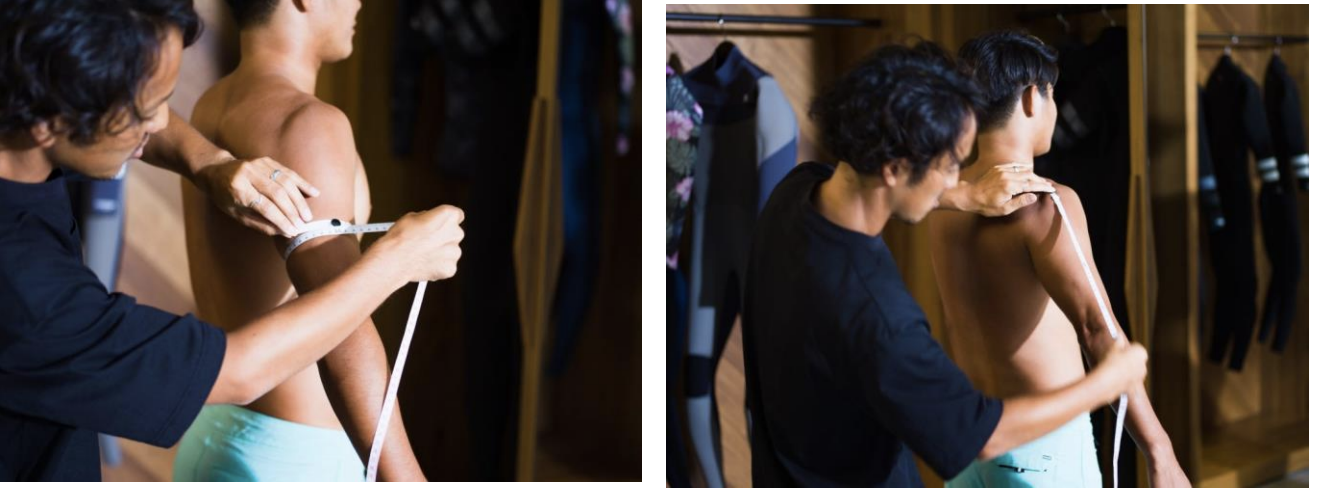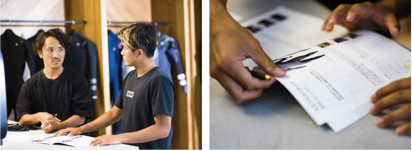 スタッフがお客様のご要望やサーフィンの頻度、ホームポイントや訪れるサーフポイントなどをお伺いし、最適なマテリアル/生地厚をご提案いたします。商品やカタログをご覧 いただきながら、モデルごとの性能、特長についてもお尋ねください。