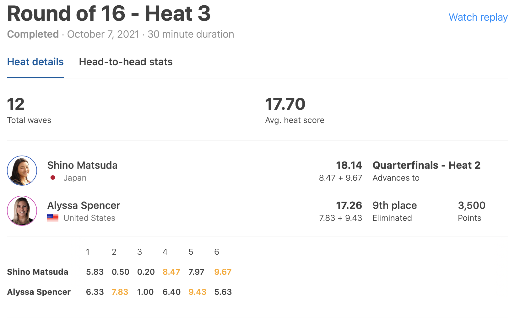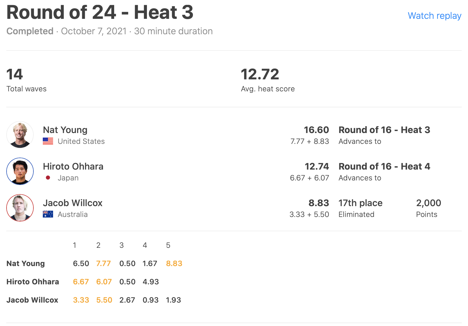 注目の日本人選手たちの活躍は、グッドスコアを2本マークした大原洋人がラウンドオブ16へ、4本目の波で8.47pt、6本目には9.67ptと2本のエクセレントスコアで逆転に逆転を重ねた松田詩野がクォーターファイナル進出を決めた!