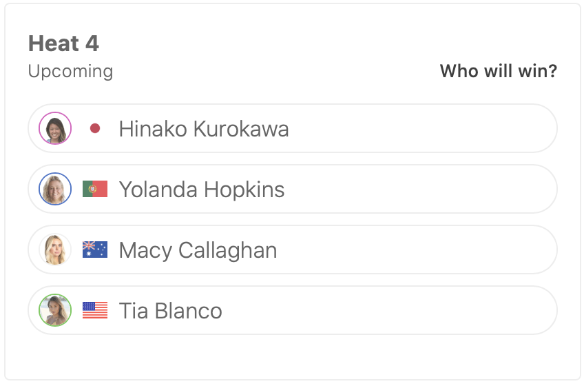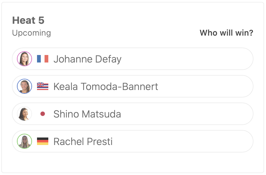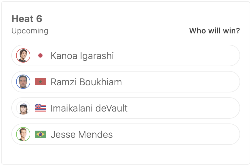 MENSで唯一勝ち上がっている五十嵐カノアはMENSラウンドオブ48のヒート6に組み込まれている。