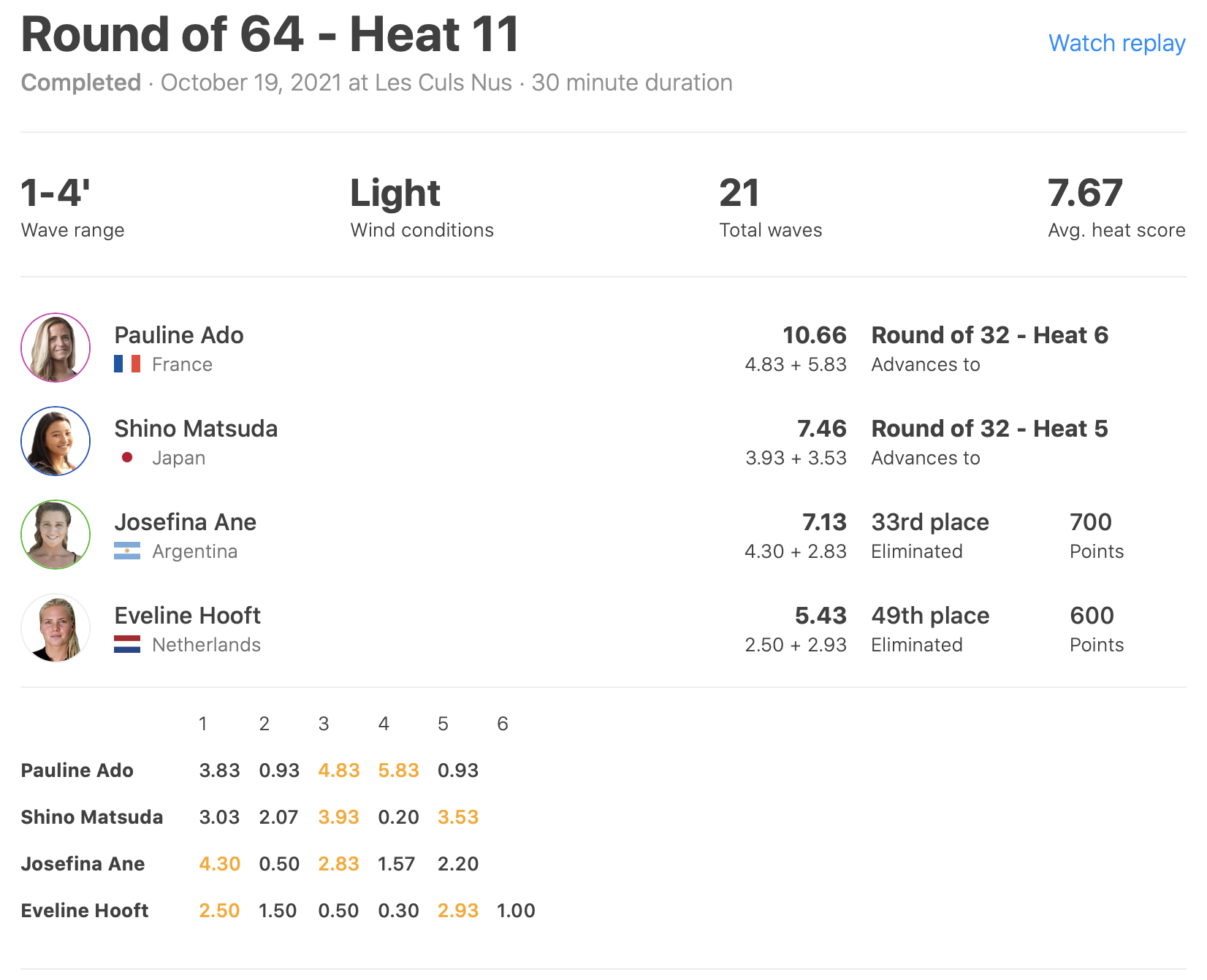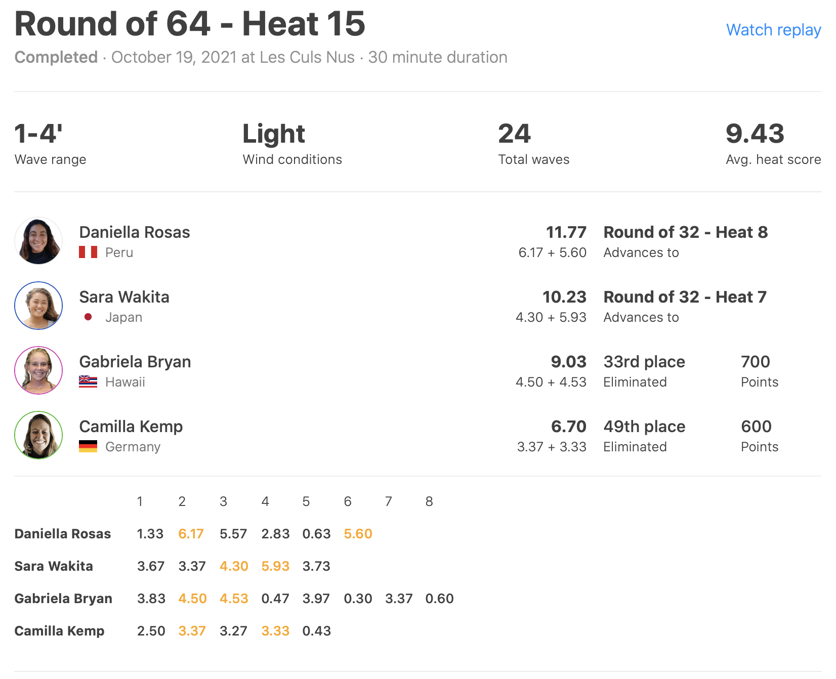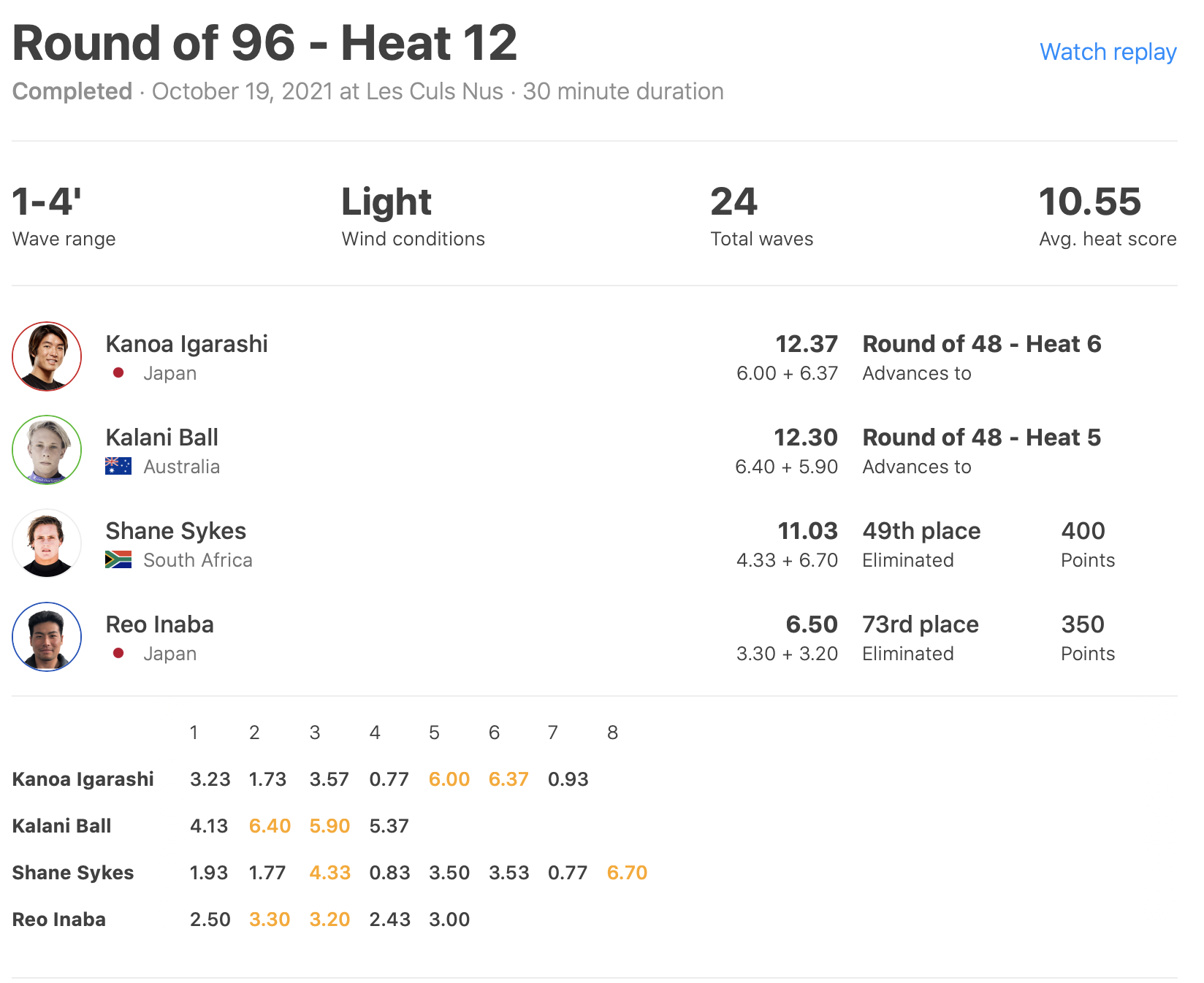 注目の日本人選手の活躍は、WOMENSのラウンドオブ64のヒート11の松田詩野と、ヒート15の脇田紗良がラウンドオブ32へ、MENSラウンドオブ96のヒート12の五十嵐カノアがラウンドオブ48進出を果たした!