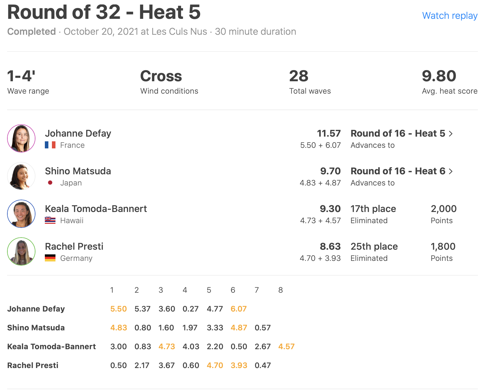 さらにWOMENSでは松田詩野が現役CTサーファーのJohanne Defayに次ぐ2位のポジションでラウンドオブ32を勝ち上がり、ラウンドオブ16へ進出!!