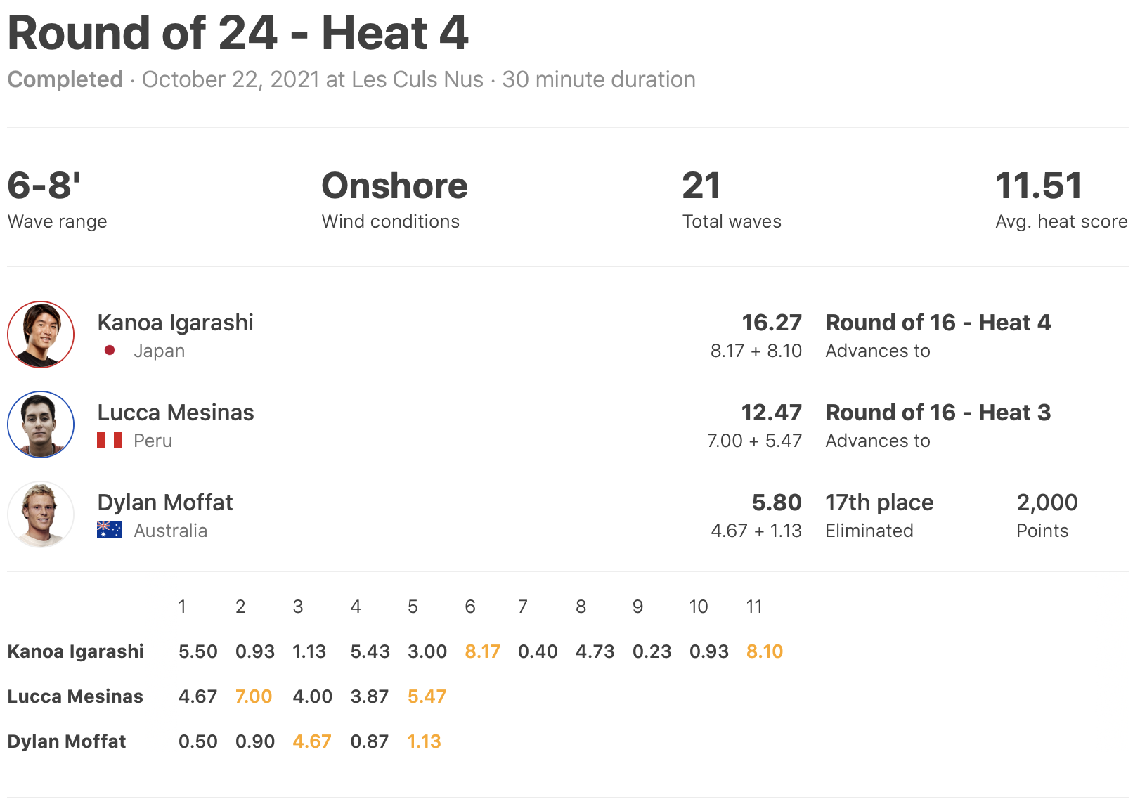 注目の五十嵐カノアの活躍は、そんなコンディションでも素晴らしいパフォーマンスで2本のエクセレントスコアを叩き出した五十嵐カノアが1位でラウンドオブ16進出を決めた!