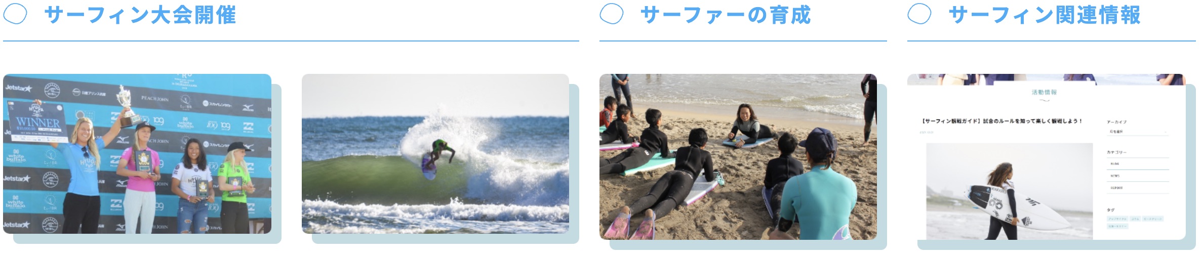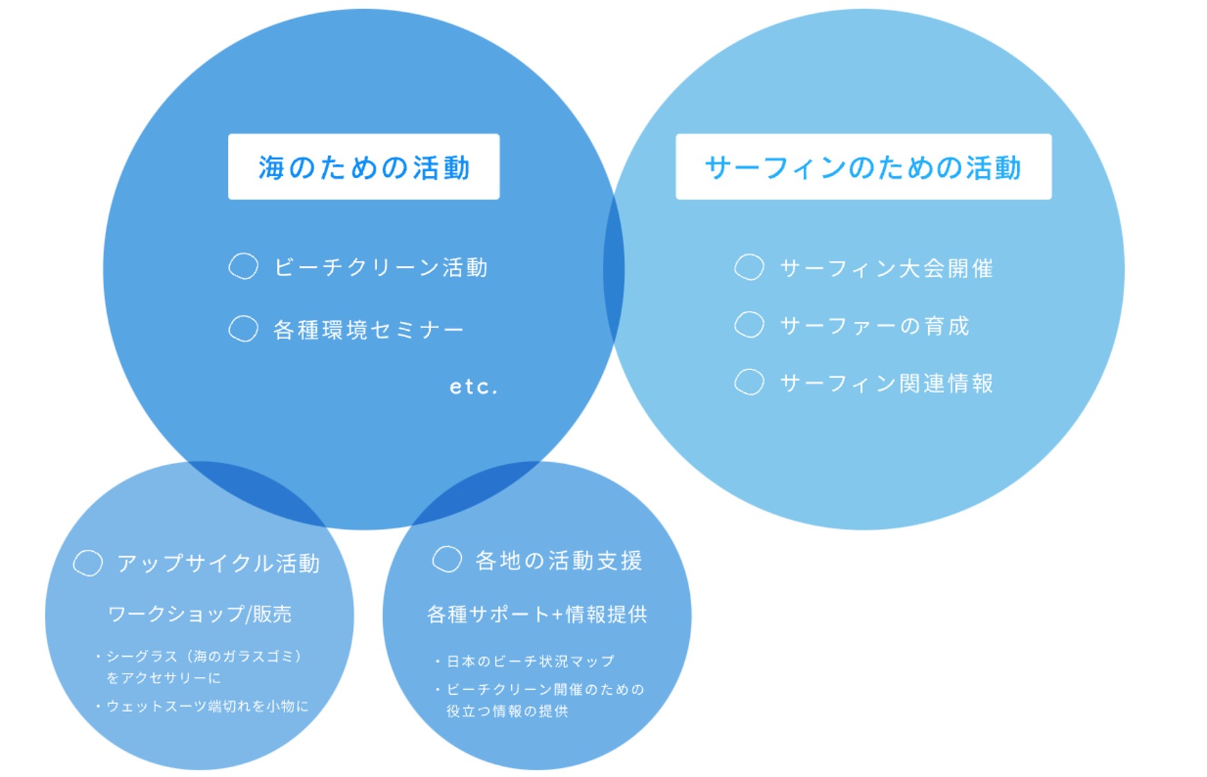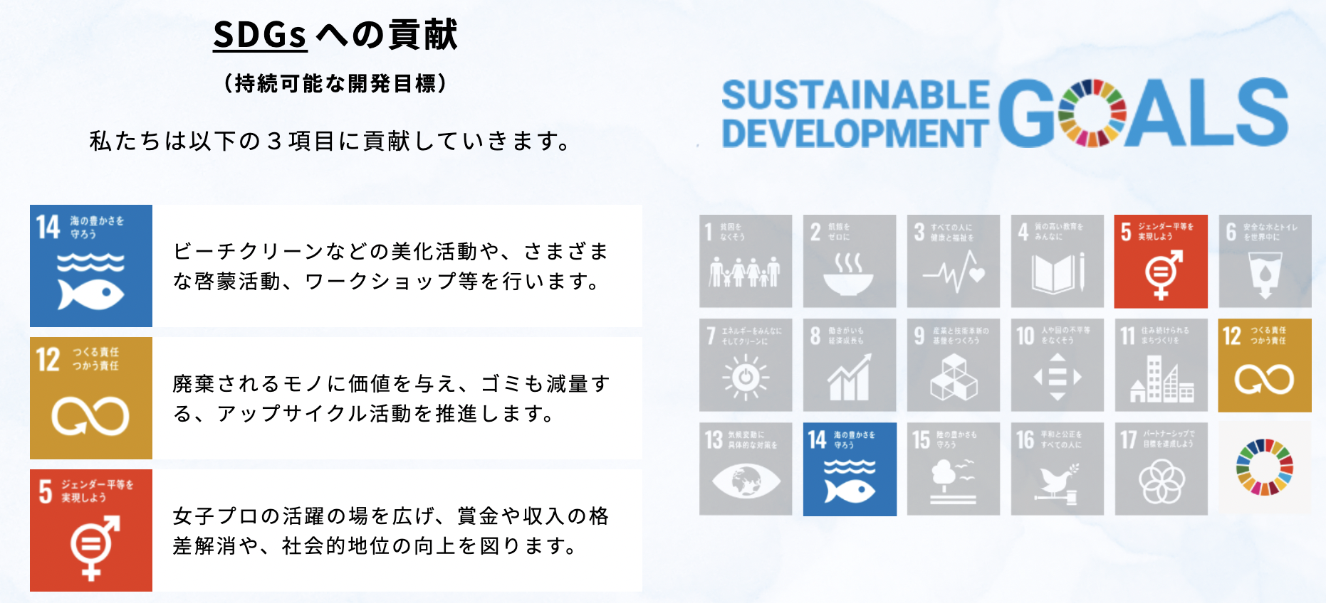 “大好きな海とサーフィンの未来のために、今私たちにできること”をテーマに、ビーチクリーンなどの”環境美化”、アップサイクルなどの”社会的取り組み”、そして”サーフィンの振興”を軸に様々な垣根を超えた活動を展開していく。