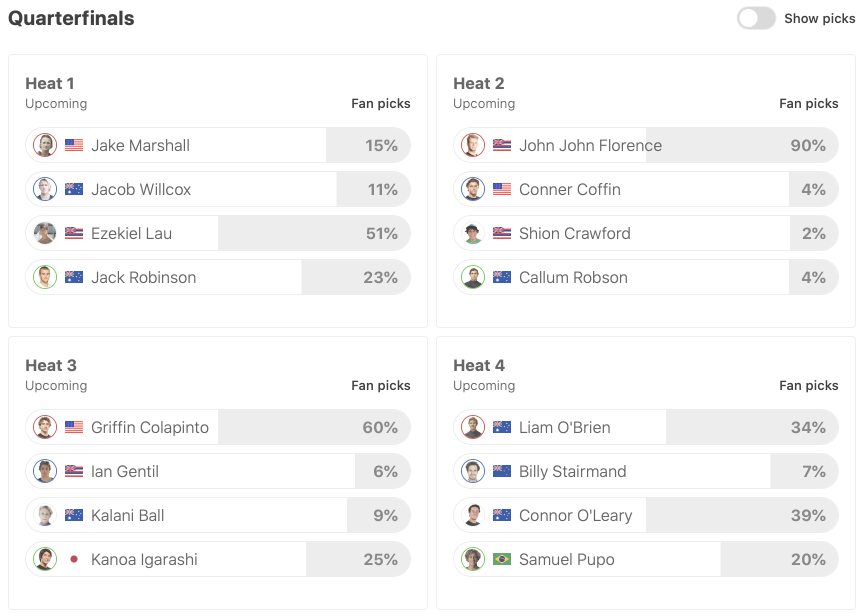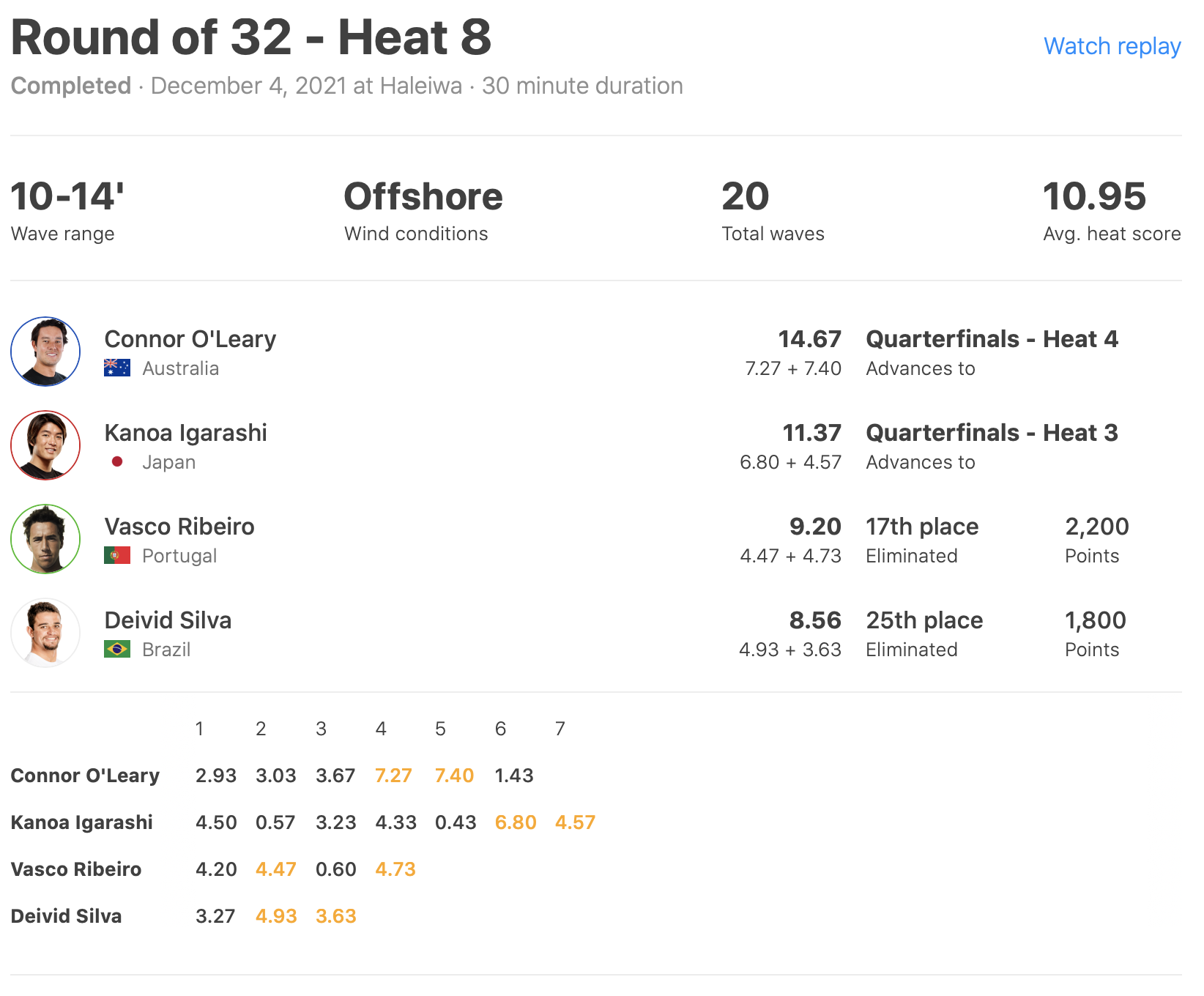 迎えるクォーターファイナルでは五十嵐カノアがヒート3に、Connor O’learyがヒート4に登場。